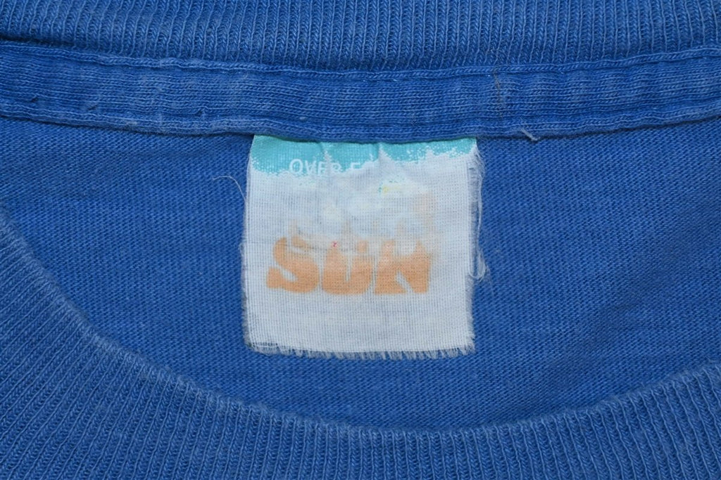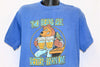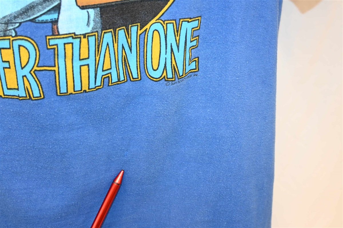 This funny cartoon t-shirt was made in the 90s and it has an image of a bear proudly holding up two mugs of beer with the phrase "Two heads are better than one". In this case the heads in question are of course referring to the heads on the mugs of beer. The shirt is made out of a comfy cotton material with bright and bold full color graphics, and it's perfect for a laugh. Plus if two people are better at solving a problem, who's to say two beers aren't also better at solving a problem?