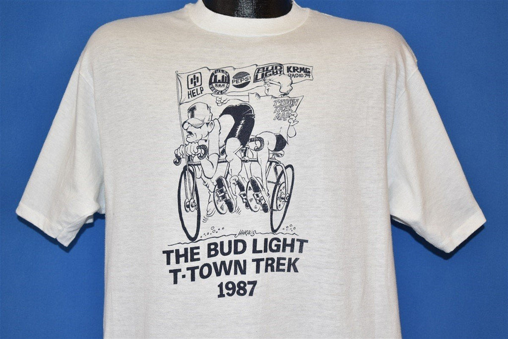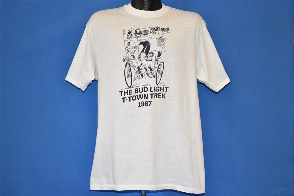 This white crewneck shirt is from the 1987 T-Town Trek, a cycling race sponsored by Bud Light, Pepsi, and Tulsa, Oklahoma's KRMG Radio. The graphic shows a man and a woman riding a tandem bicycle. The man is riding hard while the woman is reading the map and pointing.