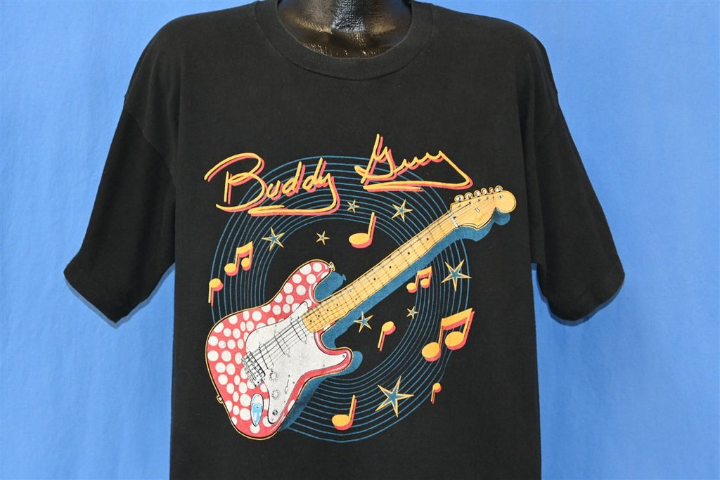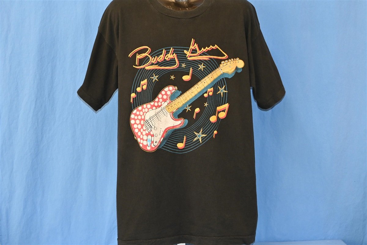 This sweet double-sided t-shirt is a souvenir commemorating Buddy Guy's Slippin' In to Your Town Tour which ran from 1995 to 1996. Buddy Guy is an American blues guitarist who began performing with various bands in the 1950s. In the 60s, Guy became a session guitarist at Chess Records, and there he played with the legendary blues musician Muddy Waters.