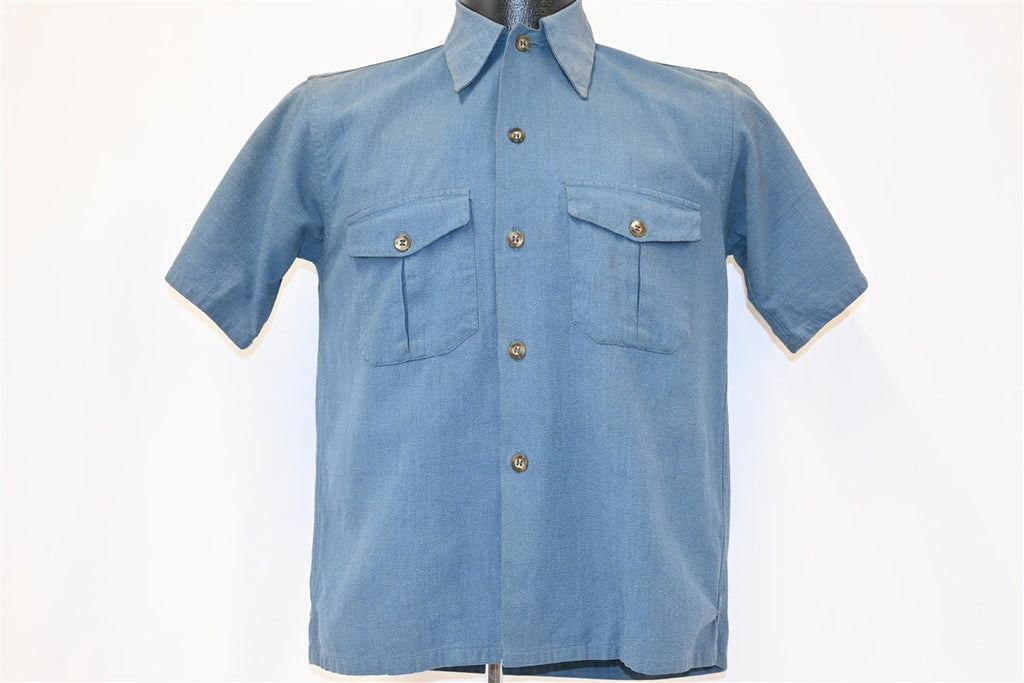 This beautiful button down was made all the way back in the 1940s, and it has held up wonderfully for more than half a century. This shirt has a square bottom hem and the buttons stop around the waist, which makes it ideal for wearing with the sort of high waisted trousers that were in style back in the 40s. This shirt comes in a handsome shade of blue and has two button flapped pockets on the chest.