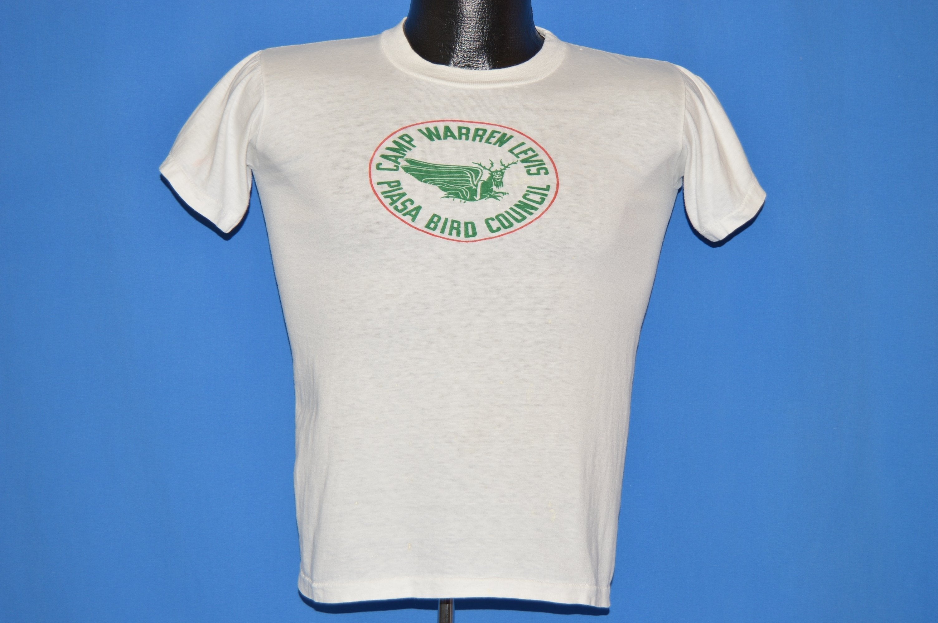 This white shirt was made in the 1950s and is from Camp Warren Levis, a Boy Scout camp in Godfrey, Illinois. The shirt features the text "Camp Warren Levis Piasa Bird Council" with a graphic of a Piasa bird on the front of the shirt. The Piasa Bird is a mythical flying creature rooted in Mississippi and Illinois folklore.