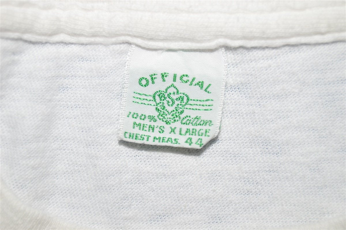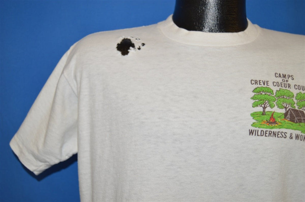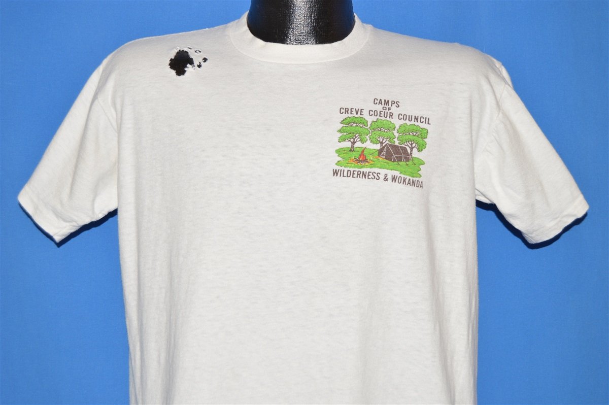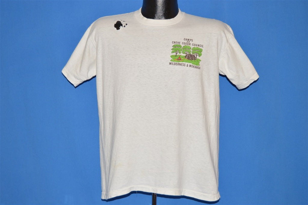 This Boy Scouts t-shirt is from the 50s and features a small graphic of a campsite with the words "Camps of Creve Coeur Council" and "Wilderness and Wokanda". Now known as the WD Boyce Council, the Creve Coeur Council was based out of Peoria, Illinois and contained the Wokanda campsite.
