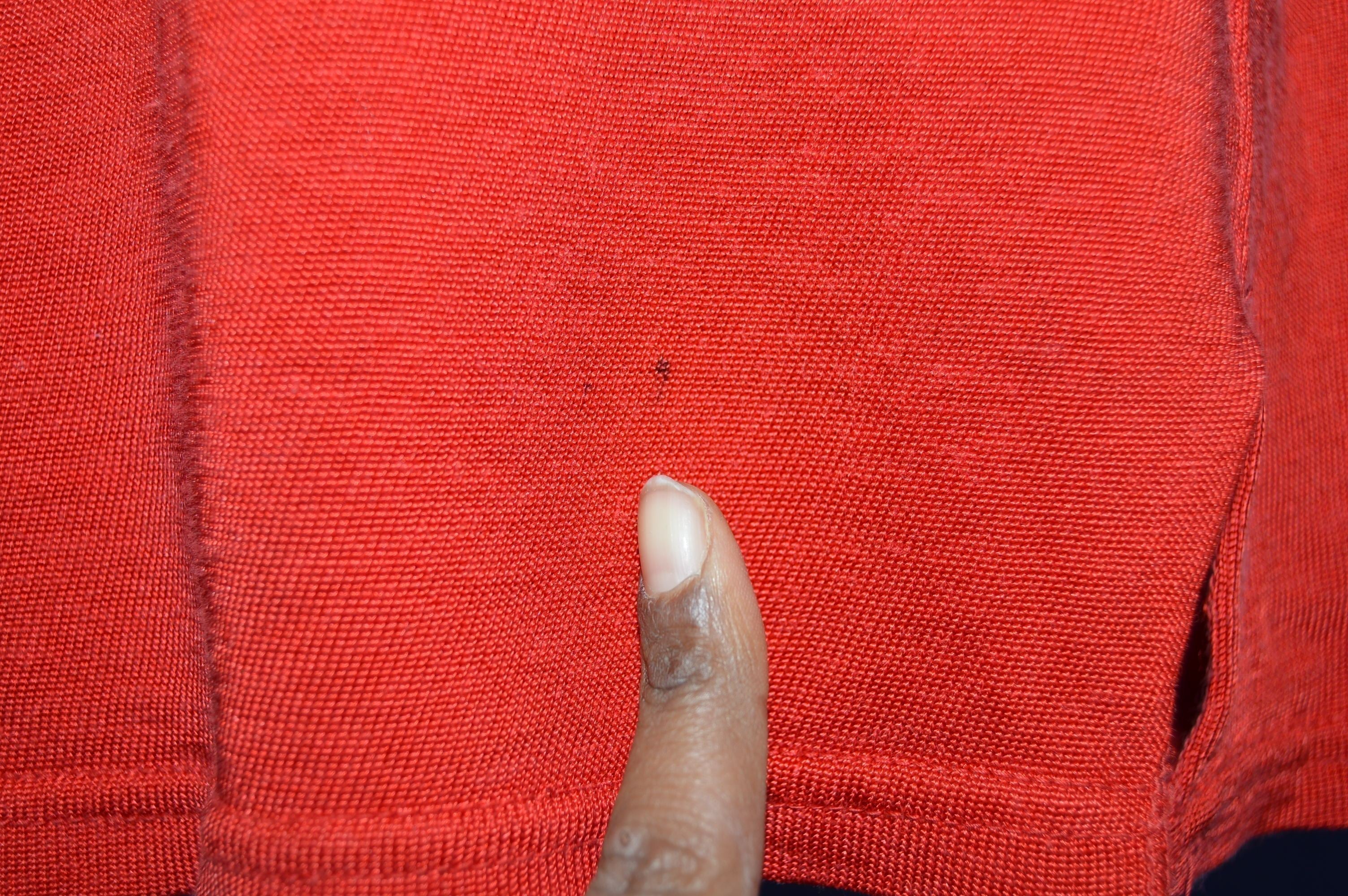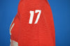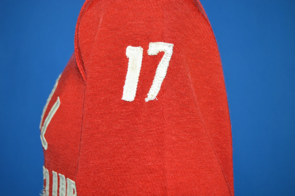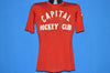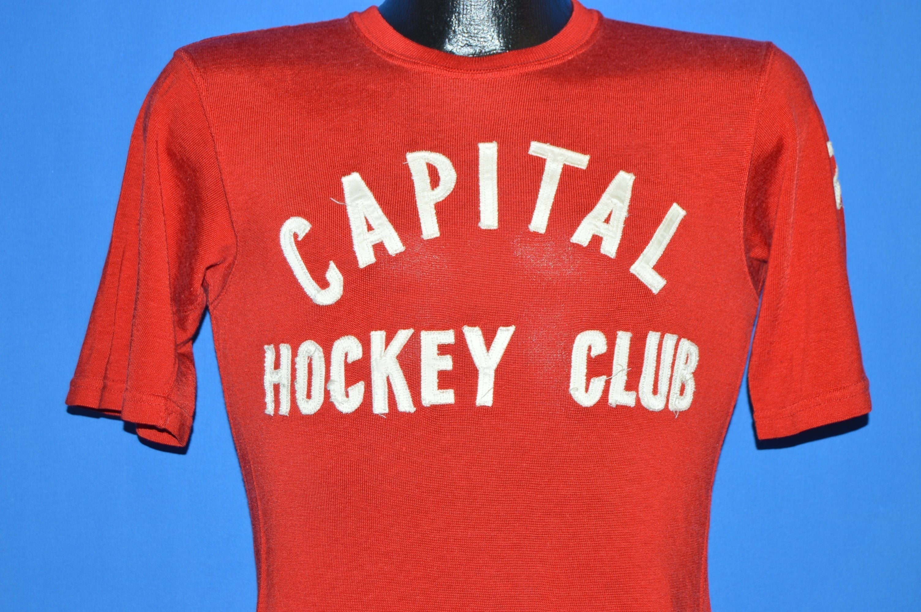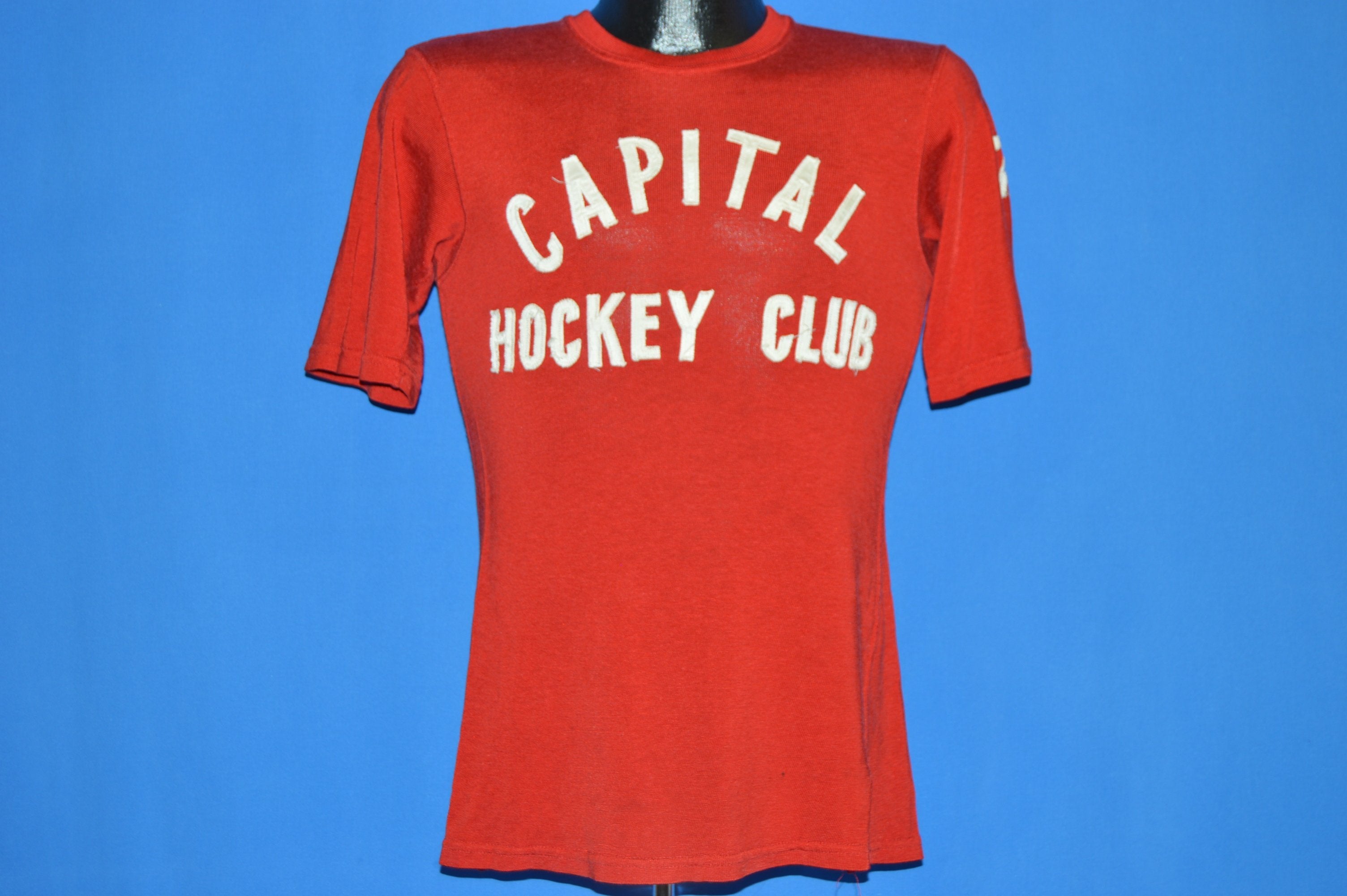 This soft red jersey is from the 50s and is in excellent condition. It has raised letter text that says "Capital Hockey Club" on the front. It also has the #17 on the back and the left sleeve of the jersey.