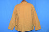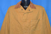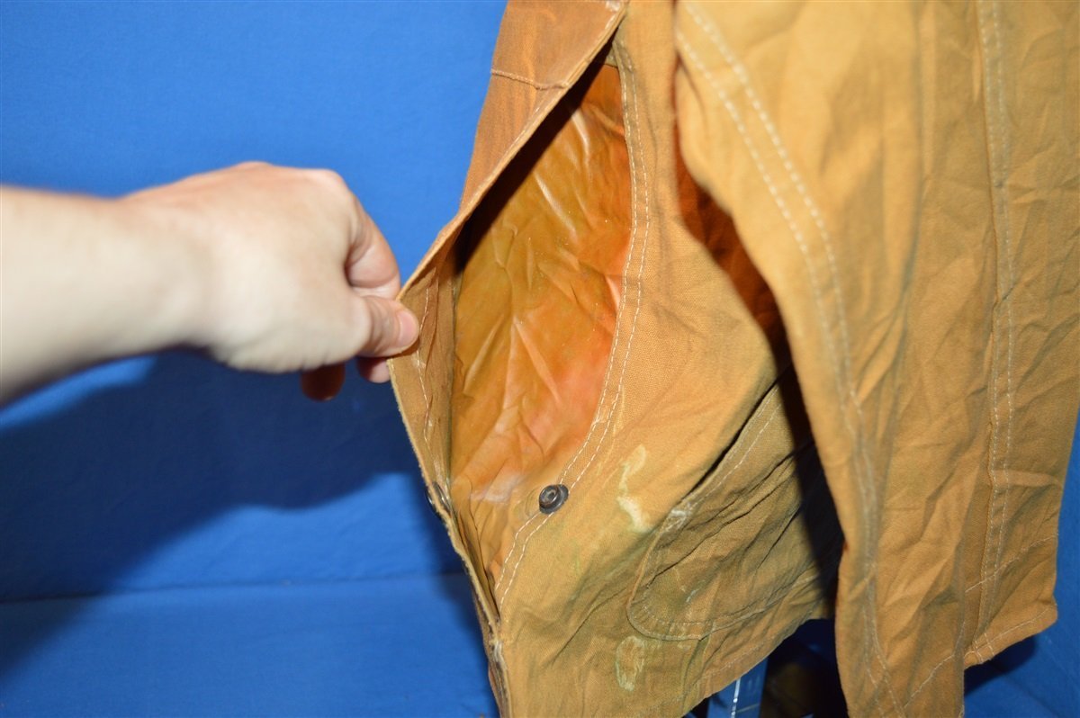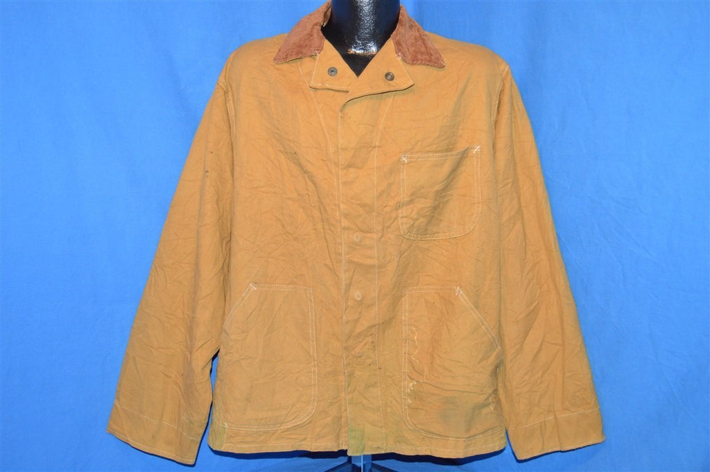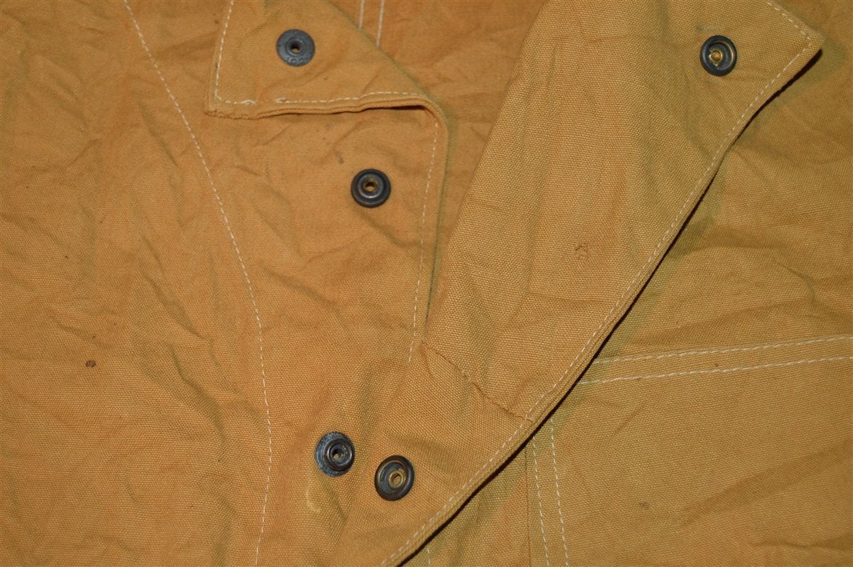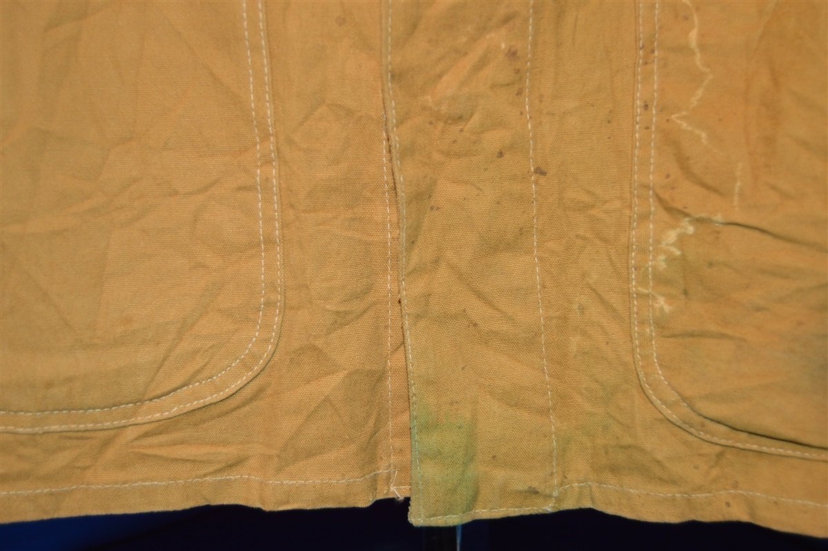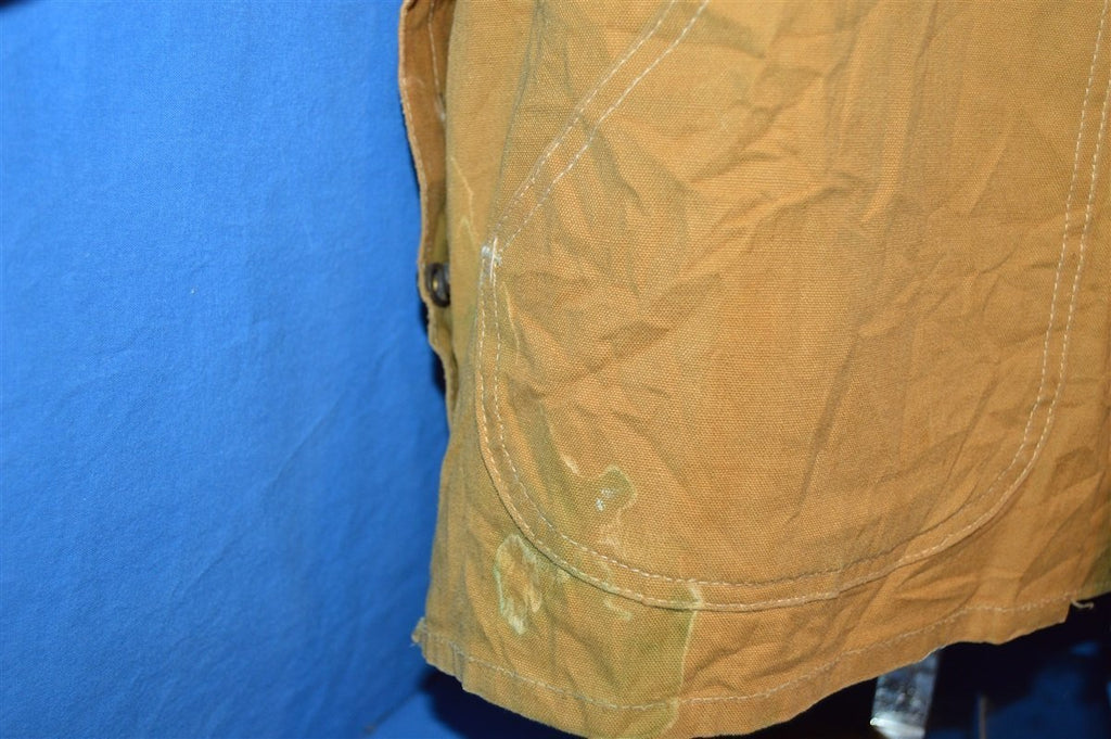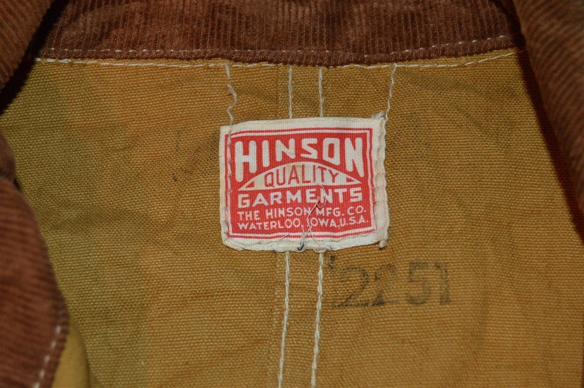 This brown duck canvas hunting jacket is from Hinson Quality Garments. It has a corduroy collar with snap closures and white stitching. The front has two hand pockets and one breast pockets. There is a large game pocket along the back which also has snap closures.