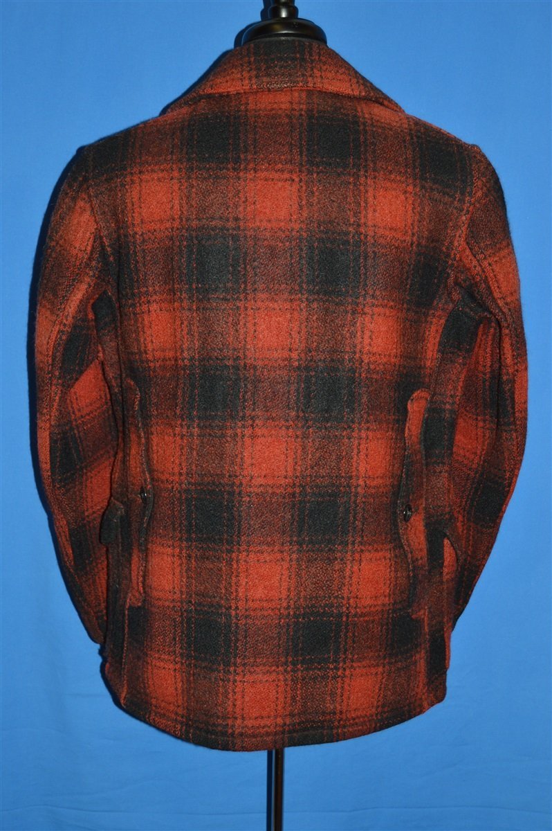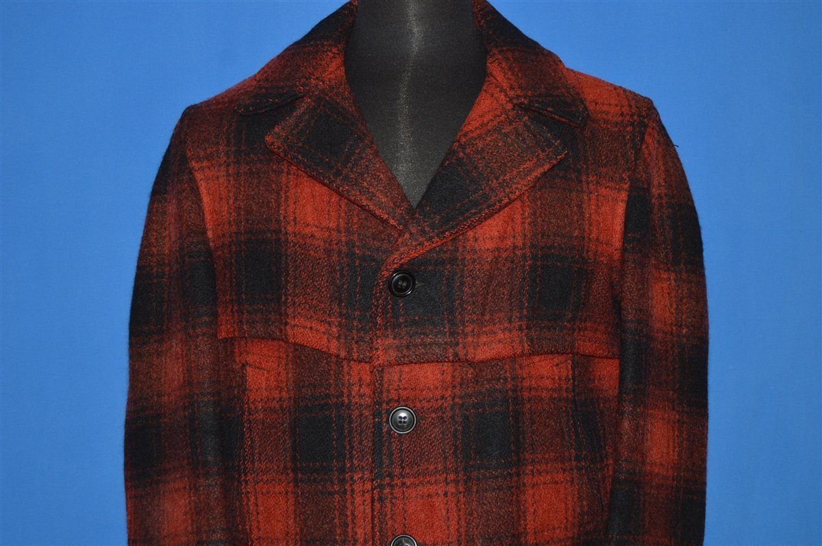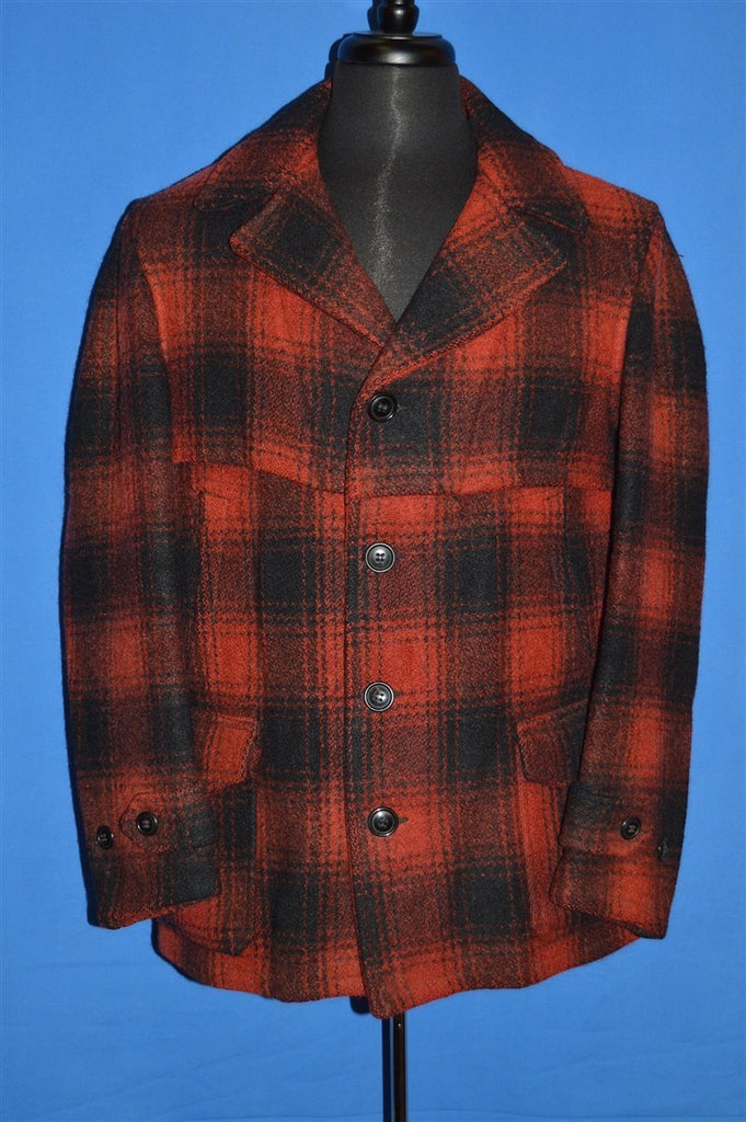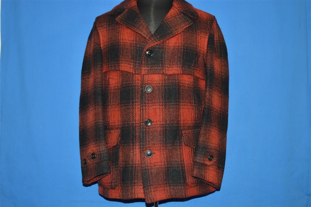 This mackinaw coat comes decorated in a red and black plaid pattern. It has black button closures and two flapped pockets. It has adjustable epaulets along the cuffs of the sleeves.