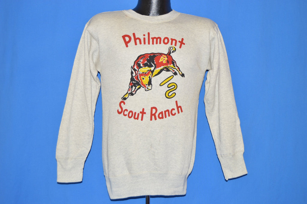 This small gray sweatshirt is from the 60s and is in excellent condition. The sweatshirt is from the Boy Scouts Of American Philmont Scout Ranch. The sweatshirt has a graphic of bull on the front with a branded "PS" on its thigh. This sweatshirt is brand new and has never been worn before!