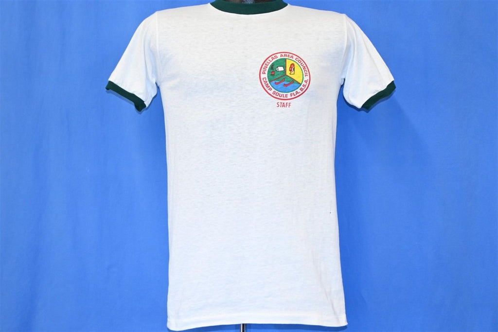This vintage boy scouts tee dates all the way back to the 1960s, and the shirt includes a graphic for the staff of Camp Soule, which was maintained by the Pinellas Area Council. The Pinellas Council has since been merged into the Greater Tampa Bay Area Council, which serves scouts located in several counties in the region of west-central Florida. Meanwhile Camp Soule has endured over many decades. Located at the heart of Clearwater, the camp stretches over more than fifty acres of wilderness and features an Olympic-sized swimming pool.