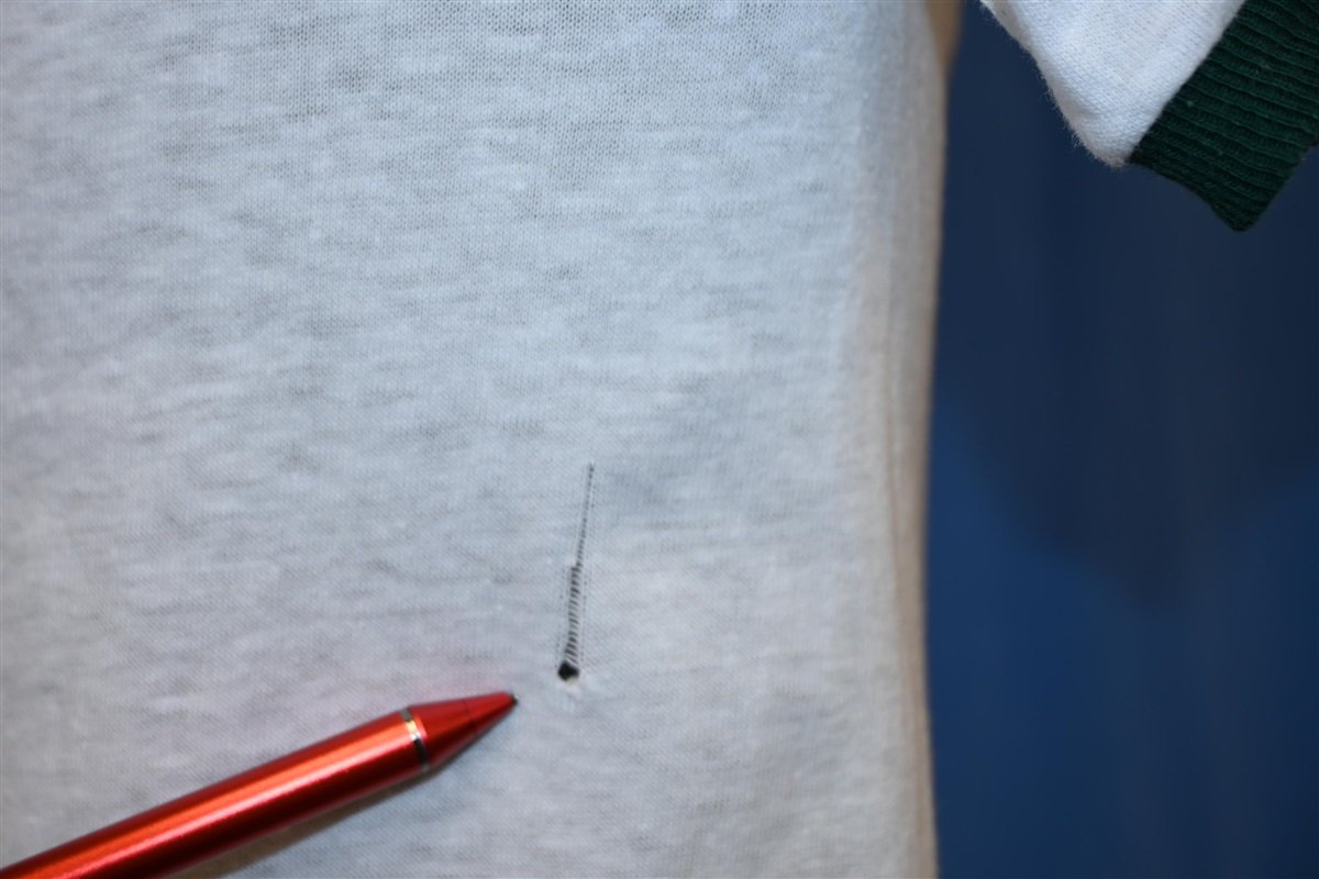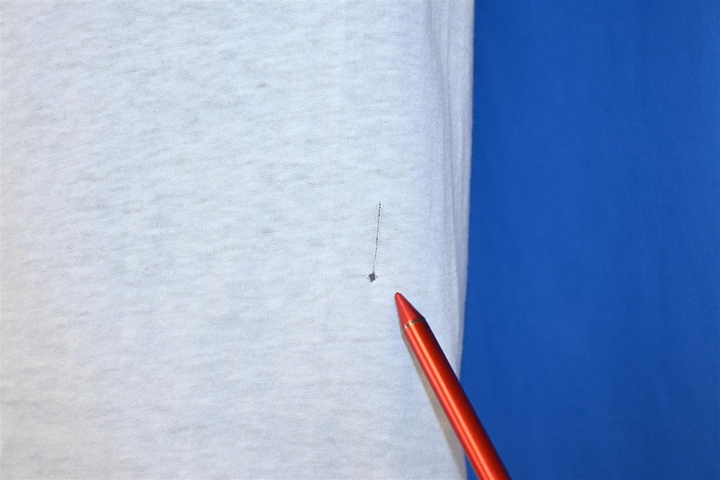 Fits like a modern unisex youth extra large. There is a run on both the front and the back, and a spot on the back near the collar, see pics.