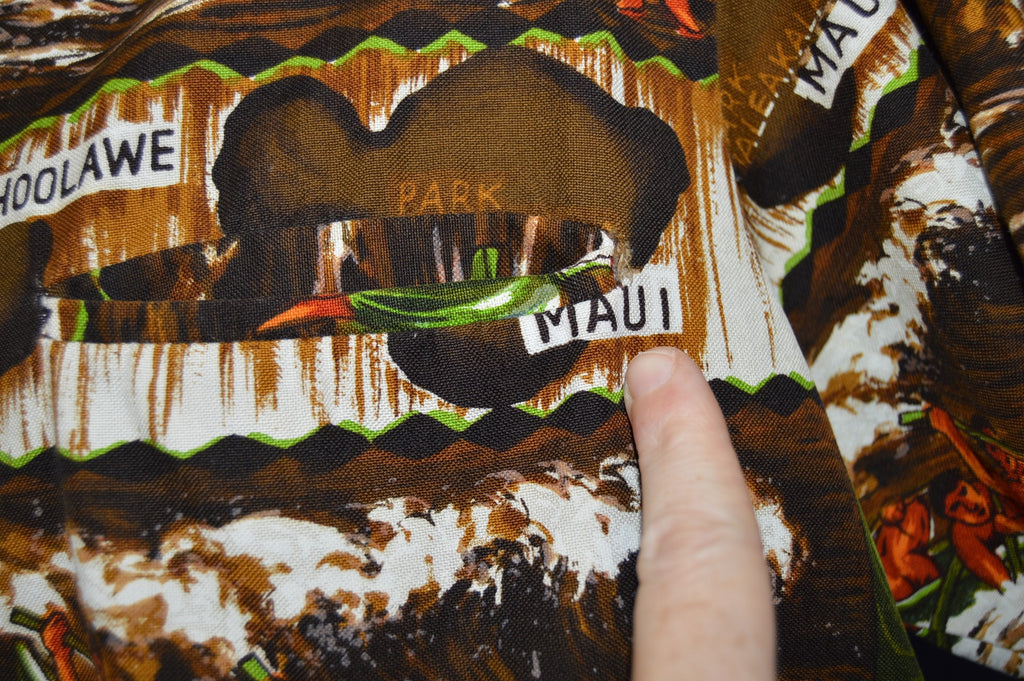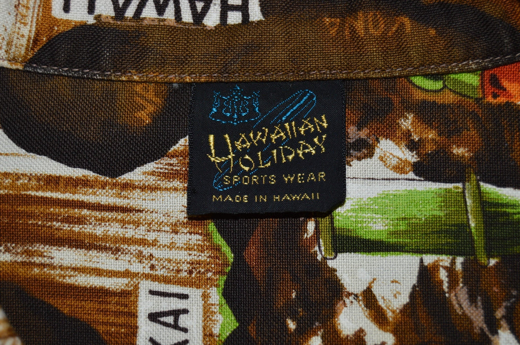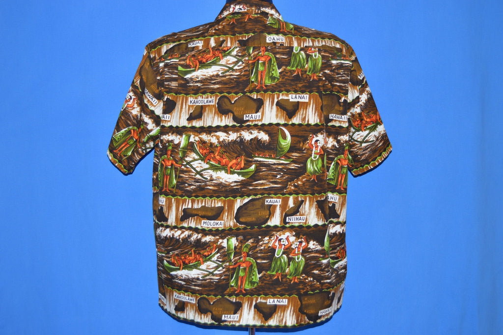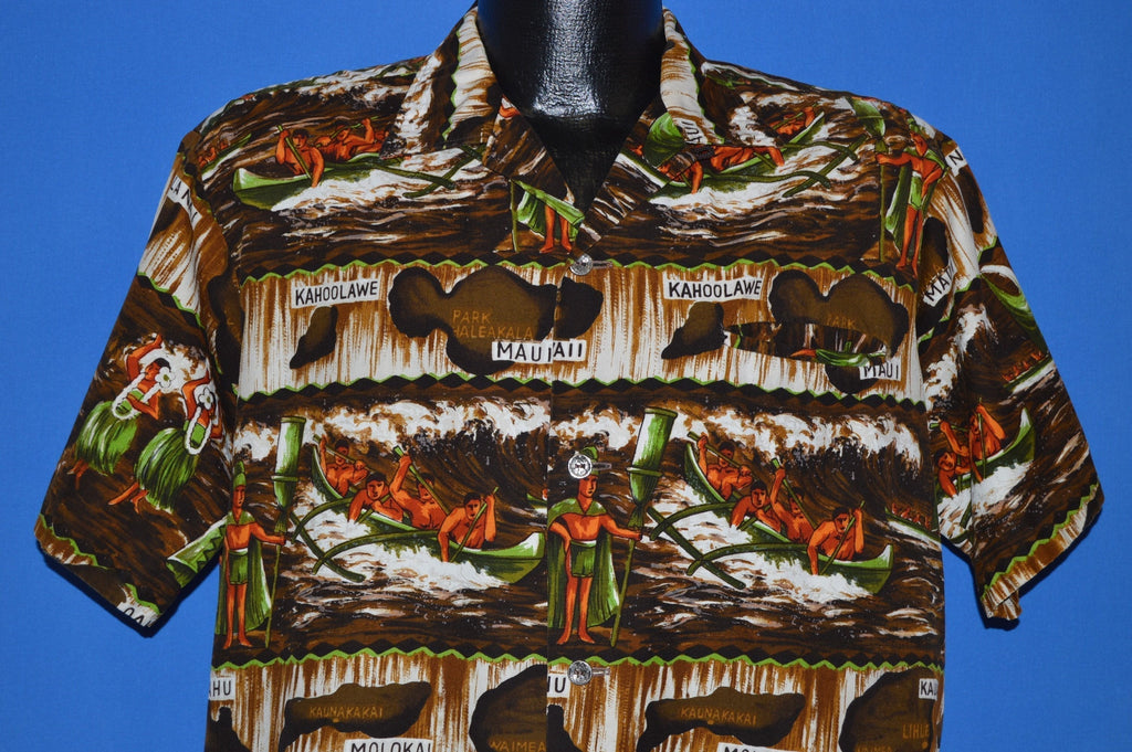 This Hawaiian Aloha shirt is from the 60s and features an all over print of men in a boat with the names of Hawaiian islands such as Molokai and Maui. It has button closures down the front. This shirt is in excellent used condition.