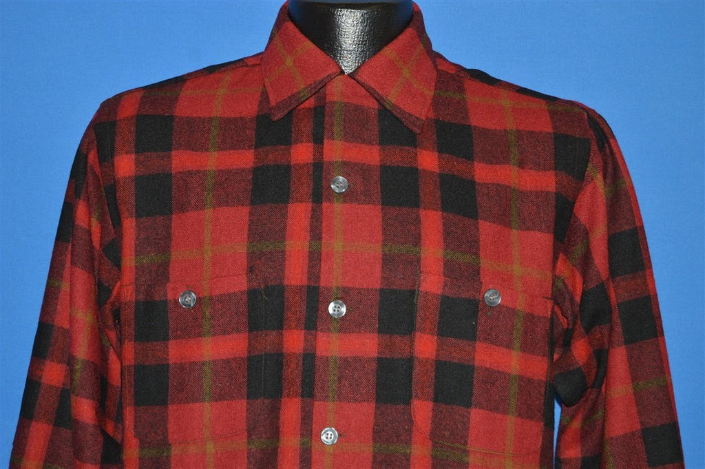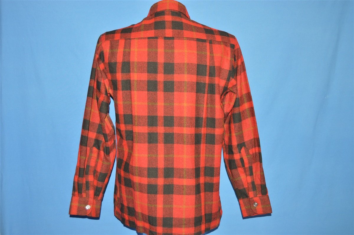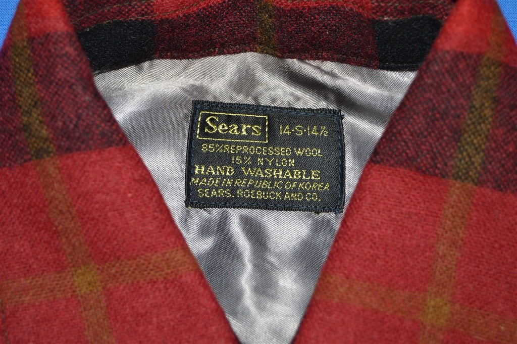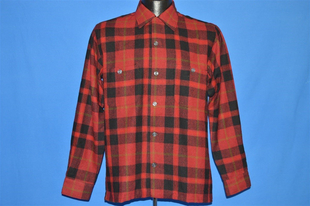 This red and black plaid shirt is from the 60s and is in excellent condition. This shirt is washable and has two button pockets on the front.
