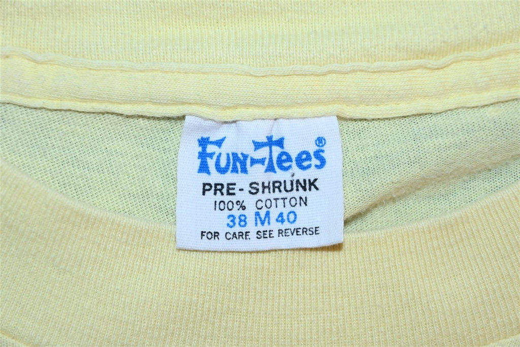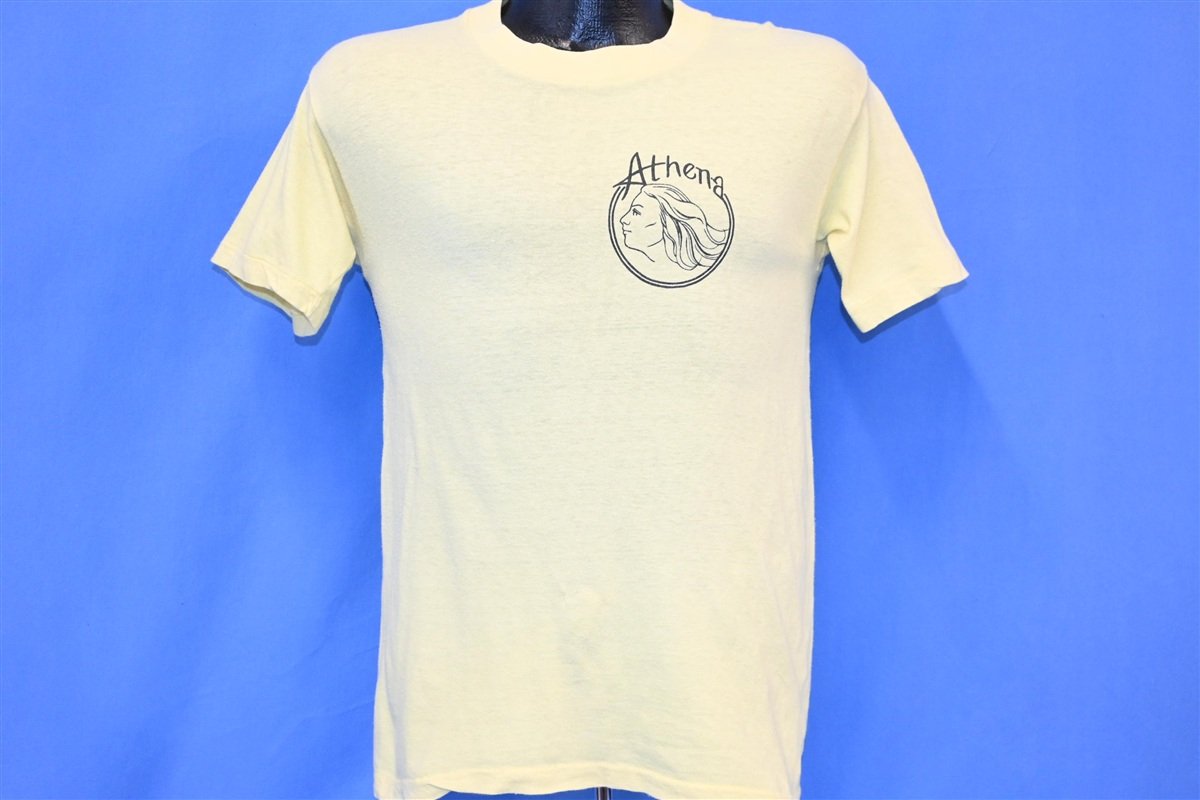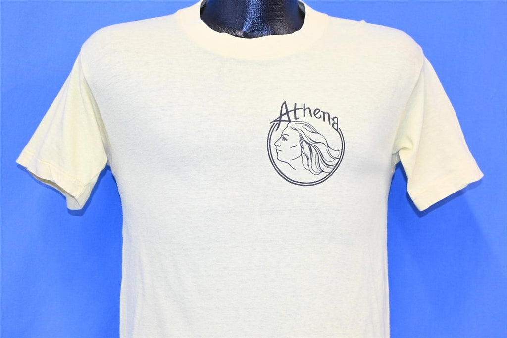 This vintage tee has a simple yet stylish, double-sided design. While the back reps the number fourteen, the front features a graphic of a the Greek Goddess Athena. Athena is most prominently known in the western world as the Goddess of wisdom and the arts, and because of this she's sometimes used as a mascot for places of education. This shirt was likely made for one of the numerous schools that was named for Athena.