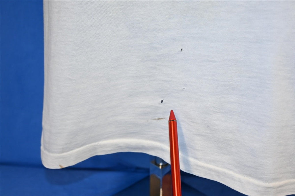 Fits like a modern unisex adult medium. This shirt is distressed with several clusters of small holes throughout, see pics.