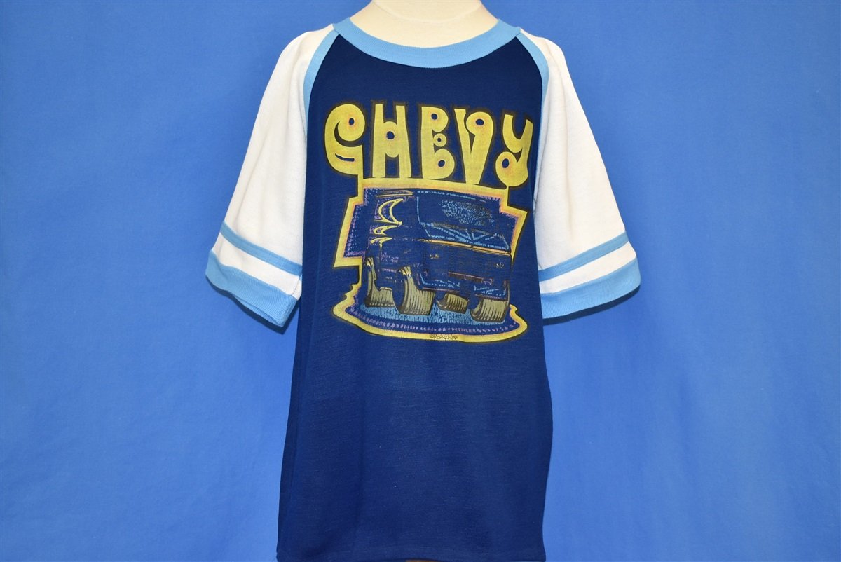 This adorable kids' tee features a classic Chevrolet truck. Features baby blue stripes over the white sleeves for that cool jersey look.