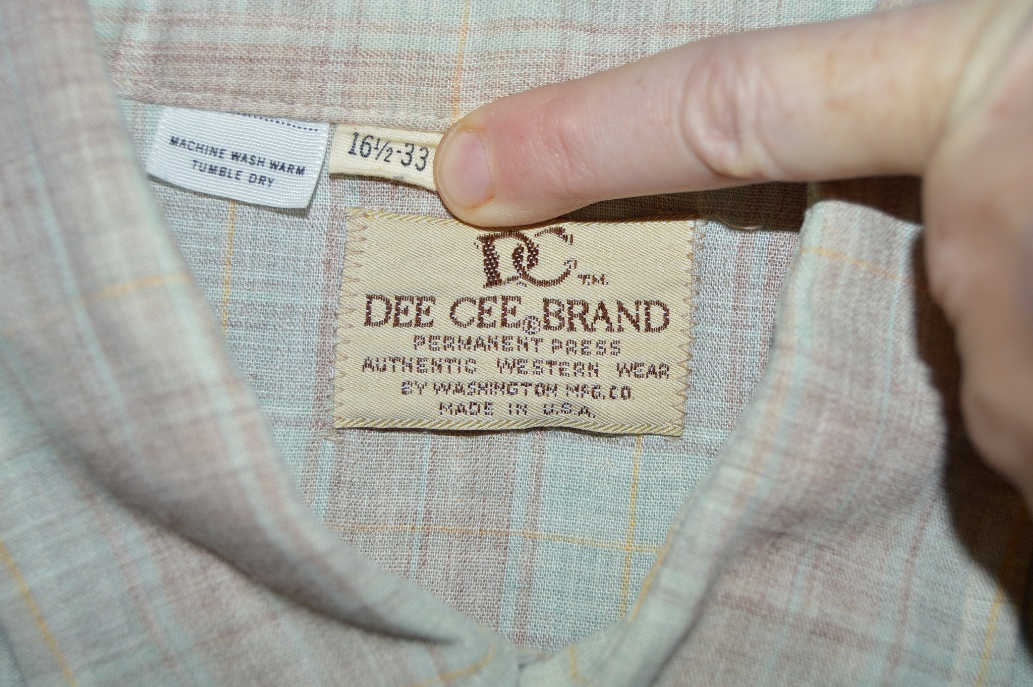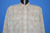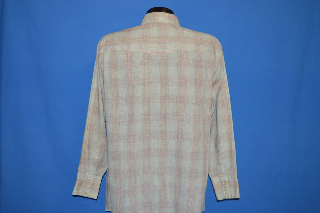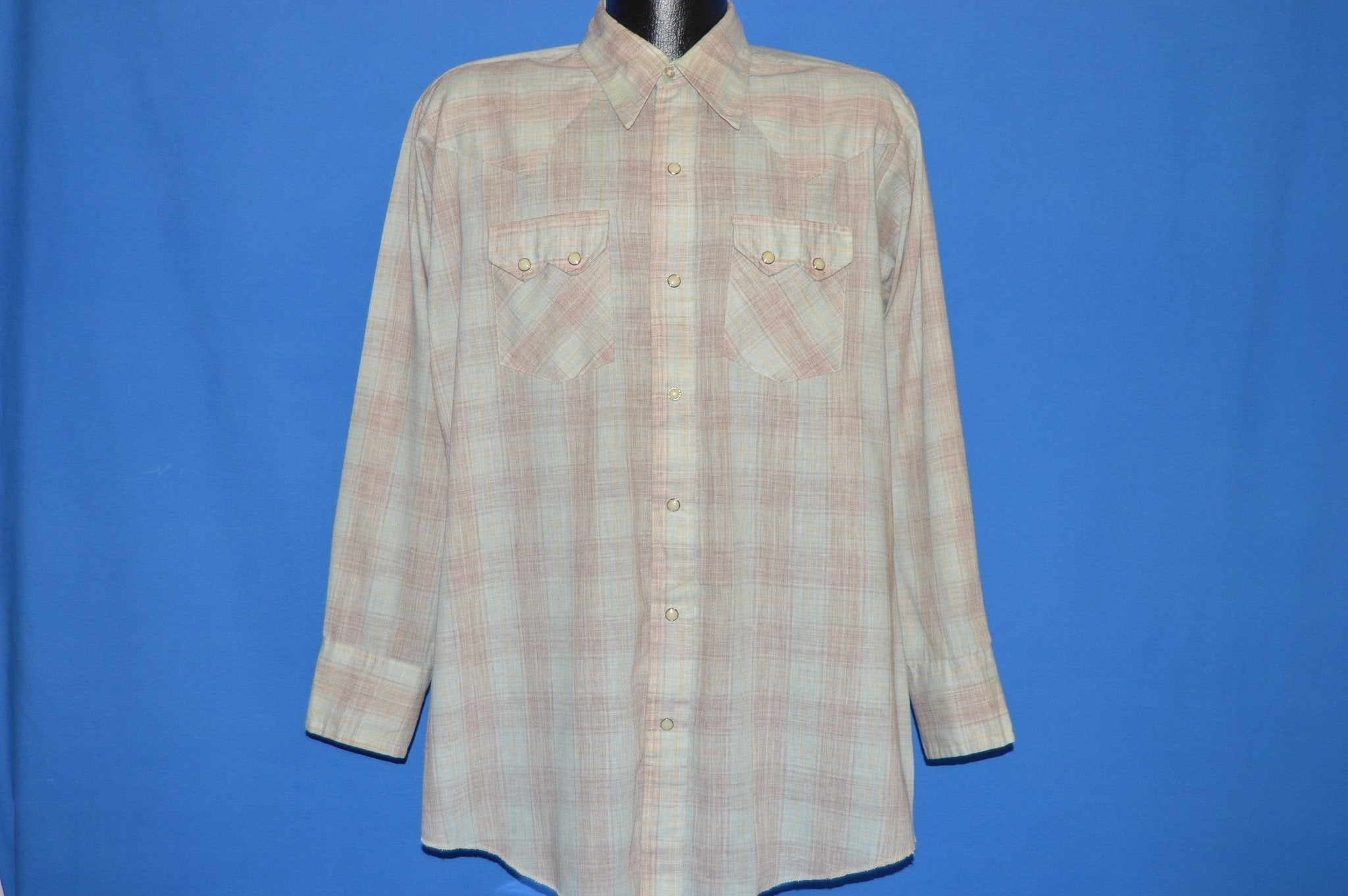 This vintage pearl snap shirt has a shadow plaid red and green design. The western style cowboy shirt has long sleeves and double scalloped pocket flaps.