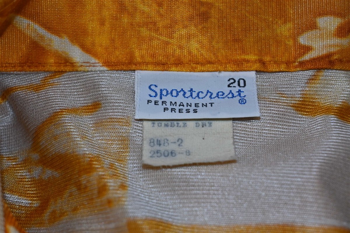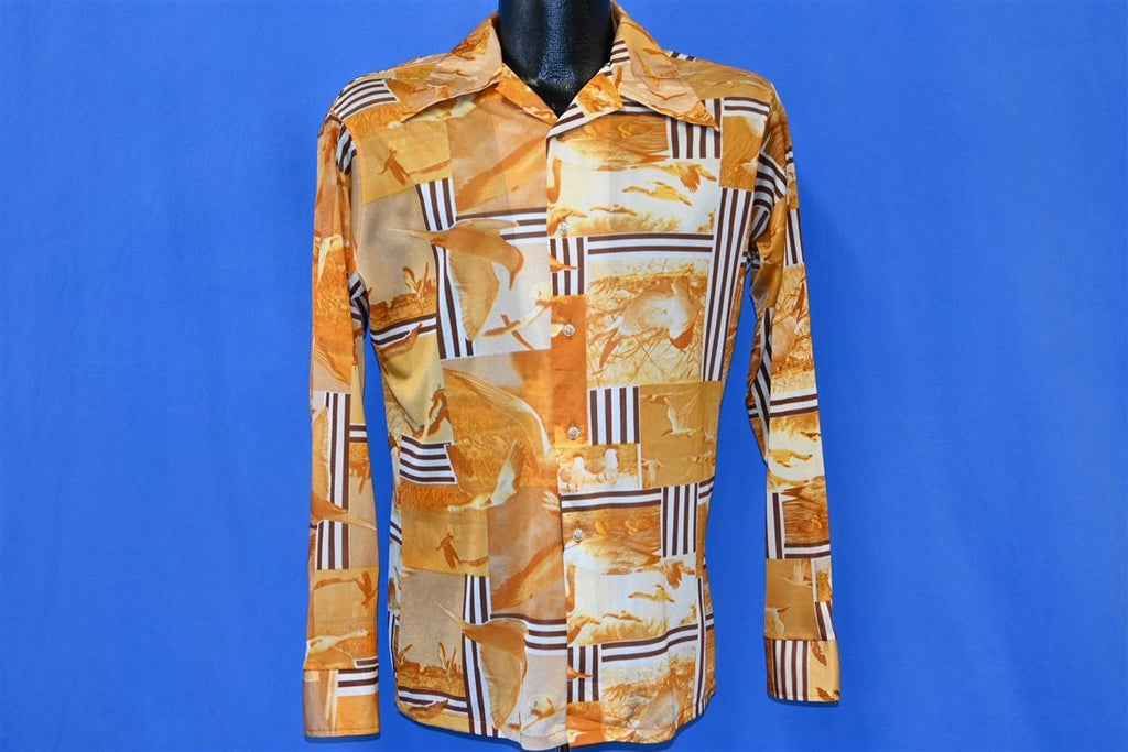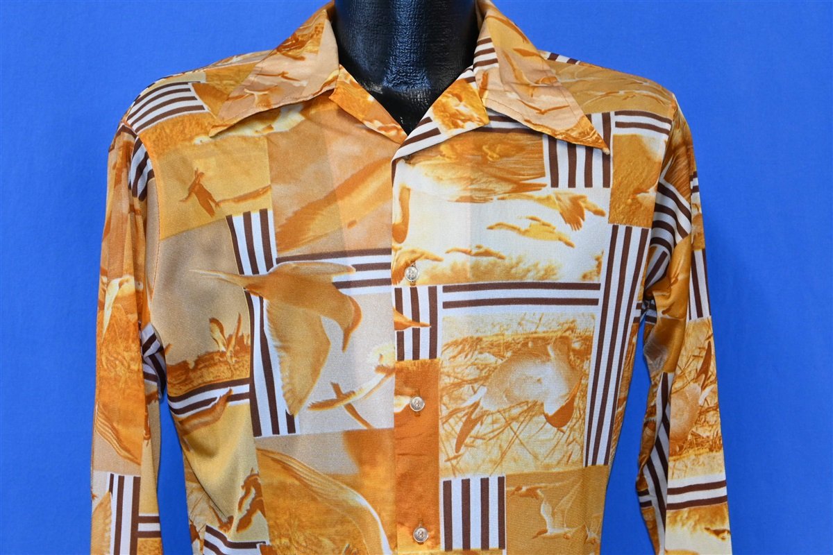 This awesome disco shirt was made by Sportcrest and it sports a classic 1970s style big collar. The shirt is made out of a comfy nylon material and it sports button front closures. The shirt also has a unique yellow abstract design that incorporates geometric elements and photographs of seagulls at the shore.