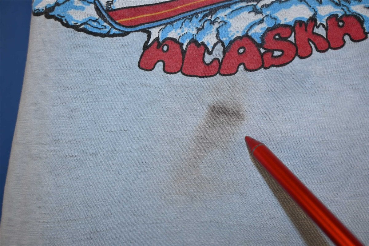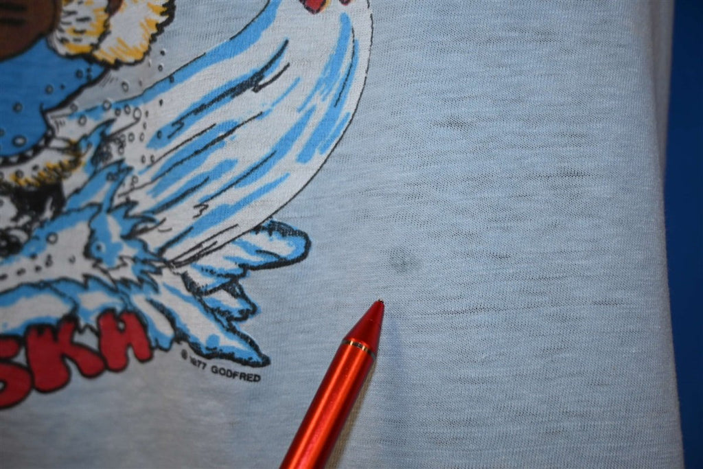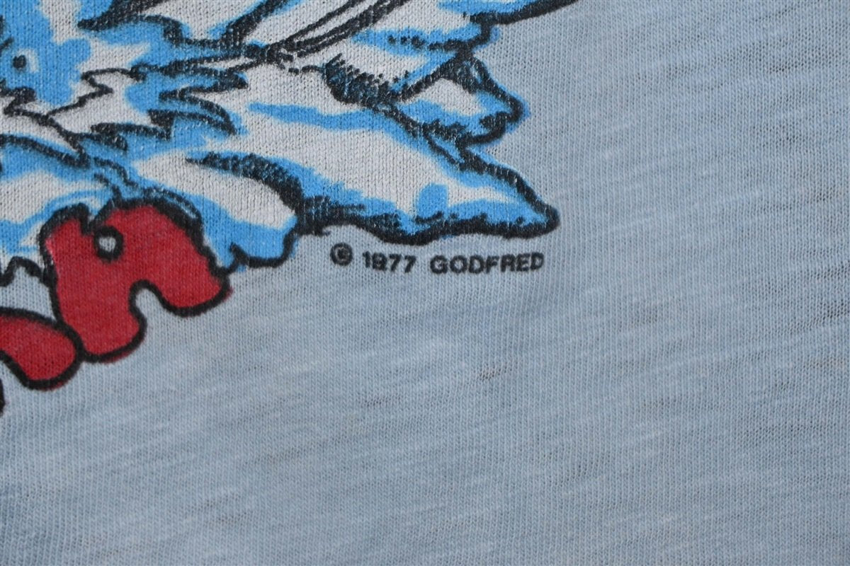 The graphic on the tee is perfectly reminiscent of the low brow cartoons that had grown popular in the 70s thanks to underground comix artists like R. Crumb and Gilbert Shelton. The image has the copyright Godfred 1977, which may be a reference to Godfred and Associates. This company used to make various souvenirs and memorabilia celebrating the great state of Alaska, and it's very possible that they may have also produced t-shirts like this one.