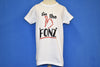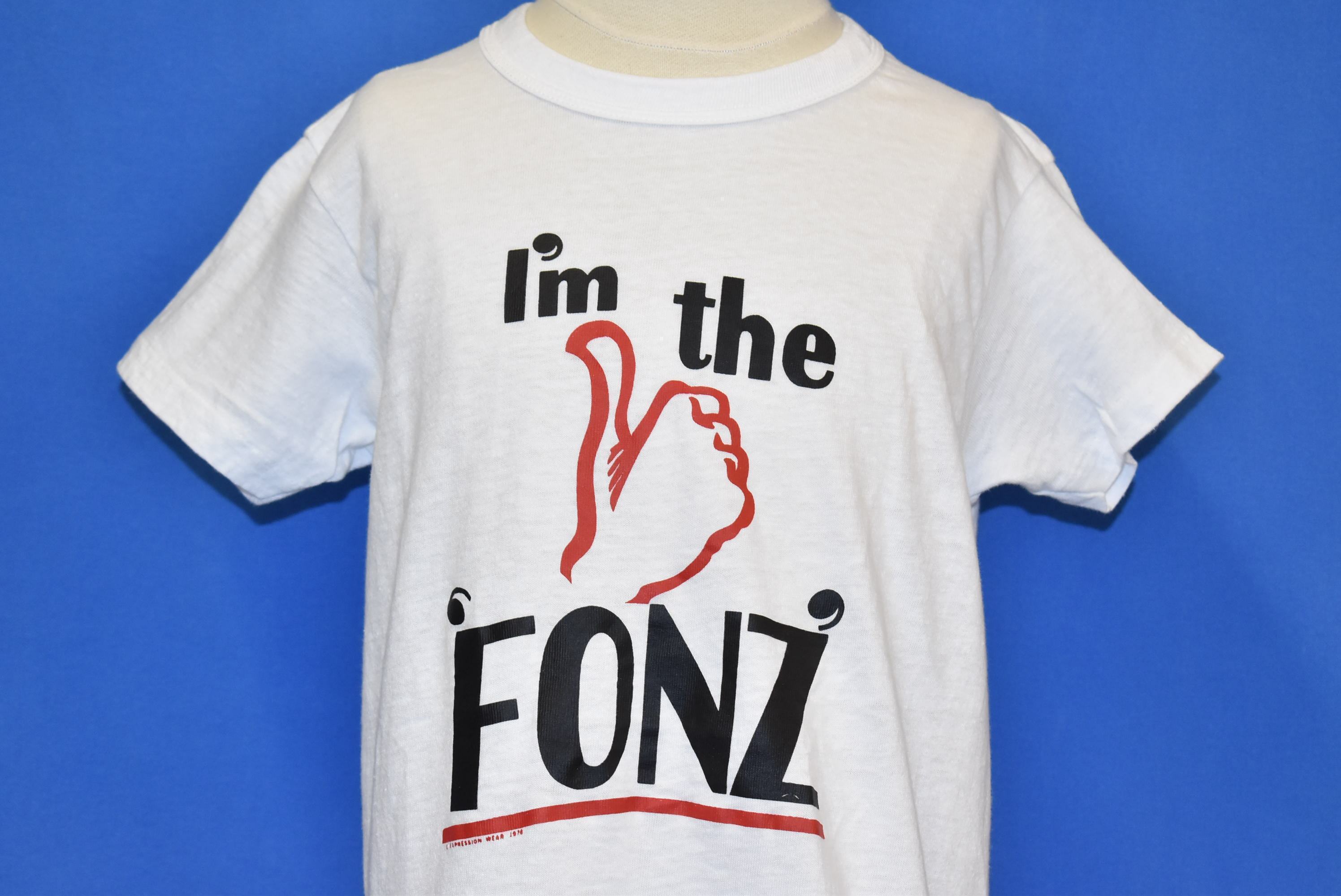 This vintage tee features an awesome reference from the 70s sitcom Happy Days. The graphic shows a "thumbs up" illustration with the catchphrase "I'm the Fonz." Arthur Herbert Fonzarelli (played by Henry Winkler) was the secondary character on the show but quickly became the lead as his popularity surpassed the other characters.