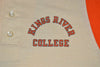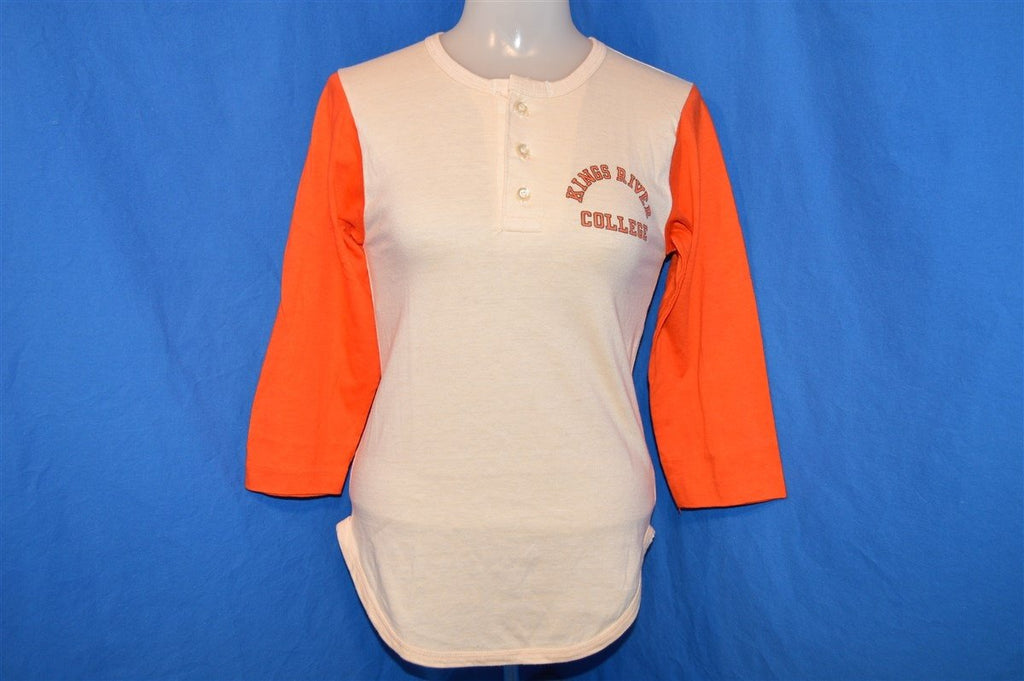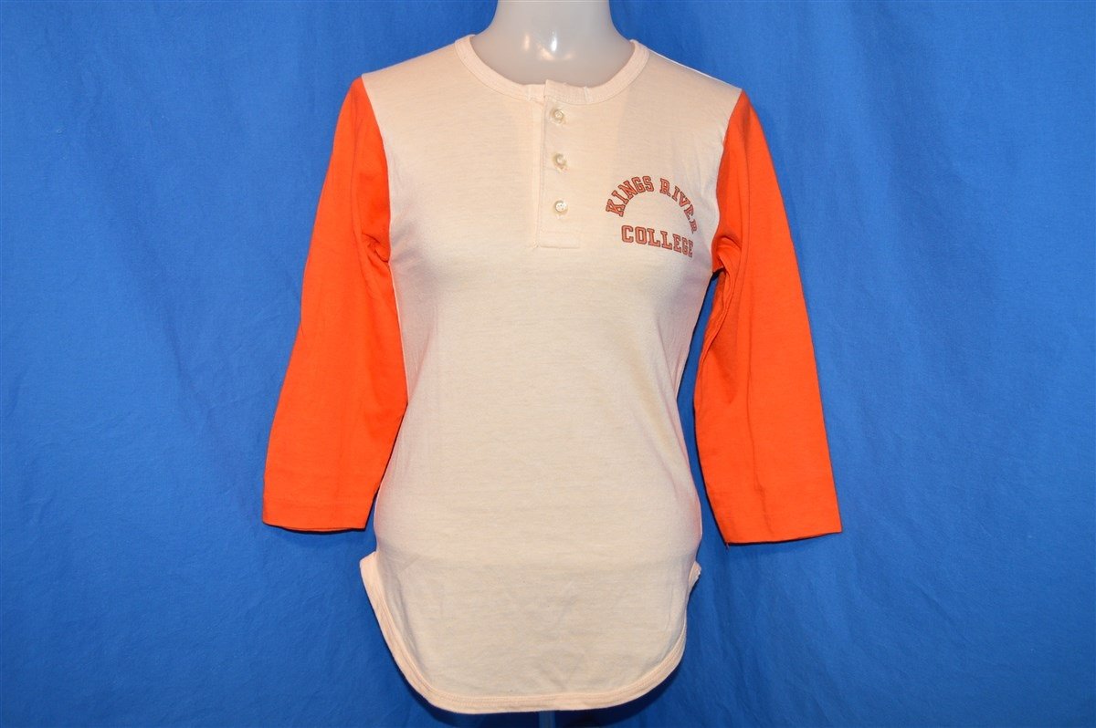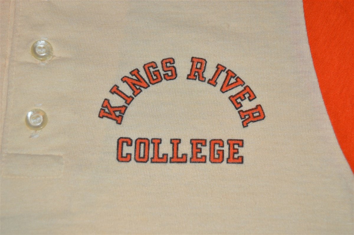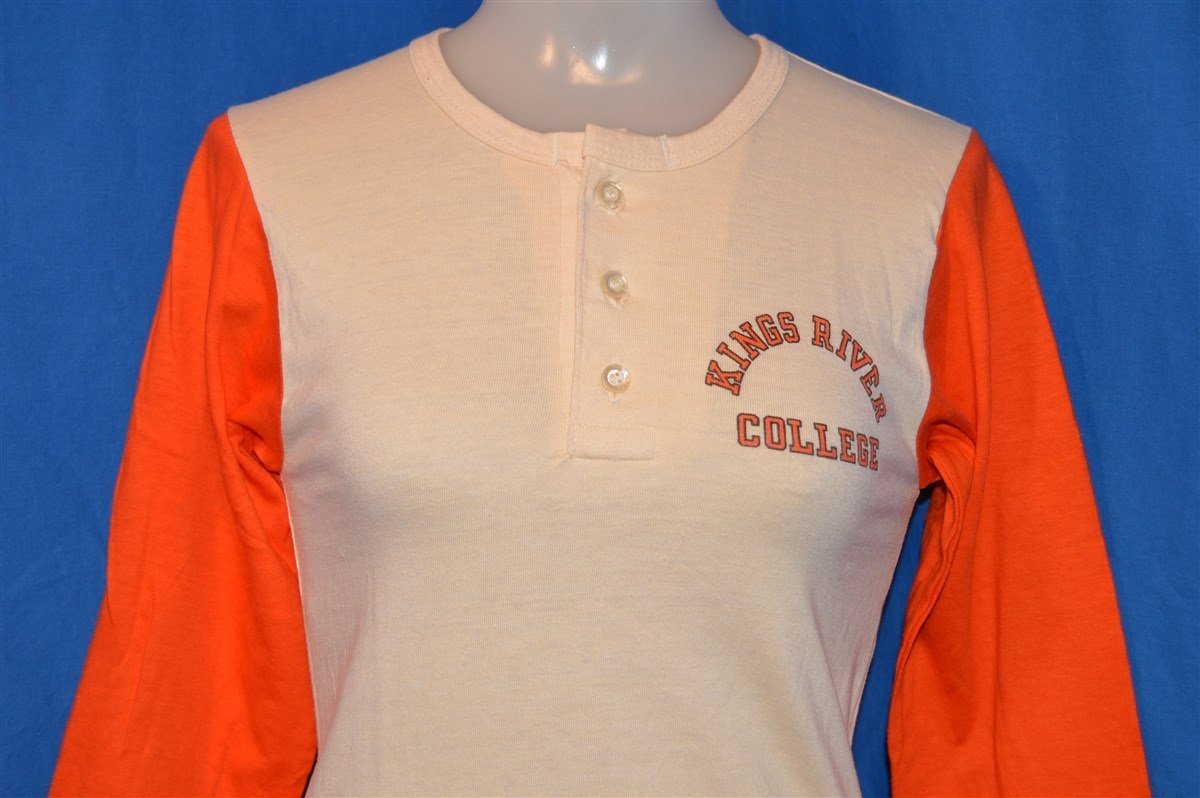 This vintage henley shirt has a white body and orange sleeves. It features a logo on the chest for Kings River College also known as Reedley College in Reedley, California. Reedley is a community college which offers associates degrees and is a part of the California Community Colleges system. It was founded in 1926 and is one of the only community colleges in California to offer on-campus housing for students.