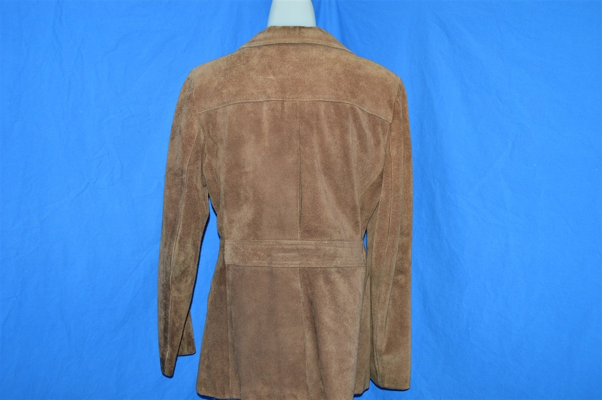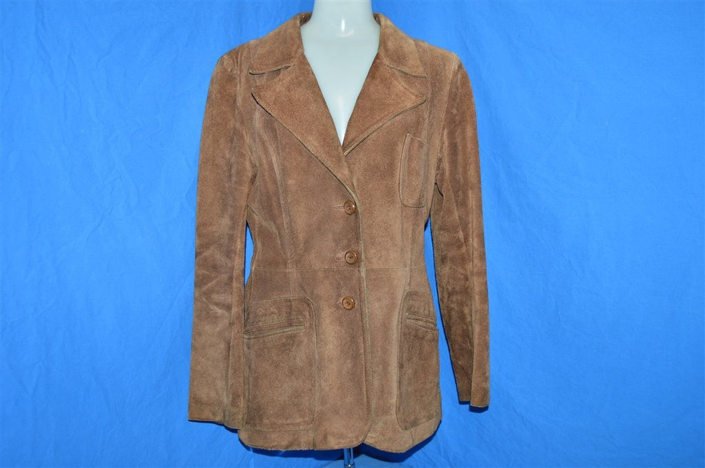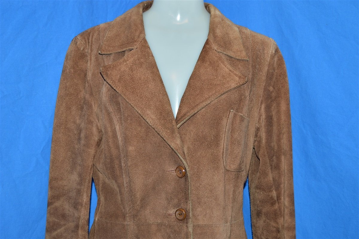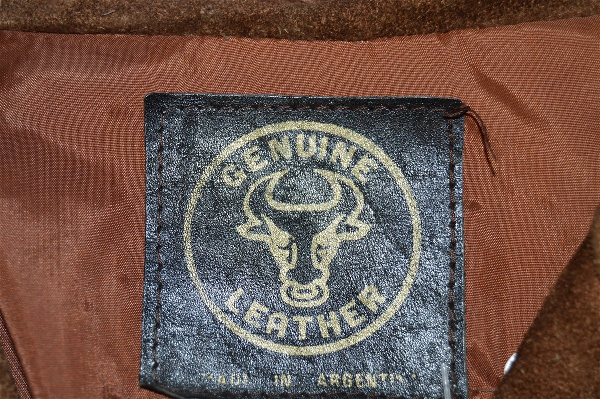 This brown women's leather jacket is from the 1970s and is in excellent condition. The jacket has a wide 70s-style collar, three button closures down the front, and a defined waist. The jacket also has a single breast pocket and two hand pockets on the front. The jacket was made of genuine leather in Argentina.
