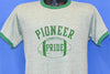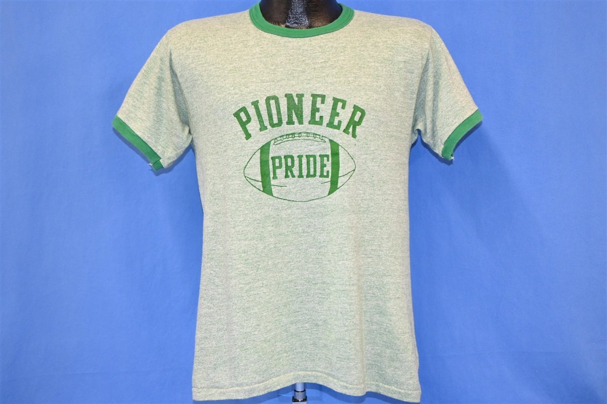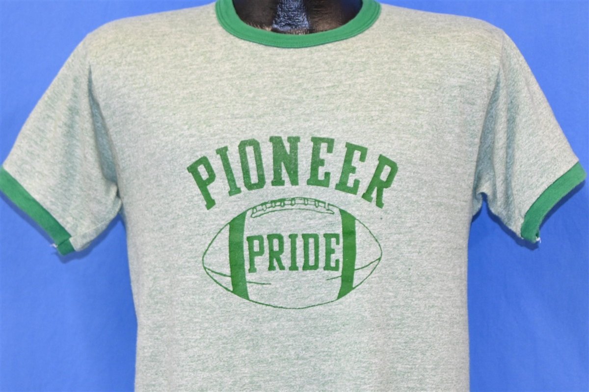 This stylish heathered ringer was made in the 70s. It features a super soft tri-blended material and the football themed logo on the front reads, "Pioneer Pride". This shirt looks like it was made to root for a local high school football team. It may have been designed for Pioneer High School in Los Angeles County, California. Although the school's athletic teams are cheered on by their mascot the Titan, the school's colors are black, white, and green like this tee.
