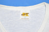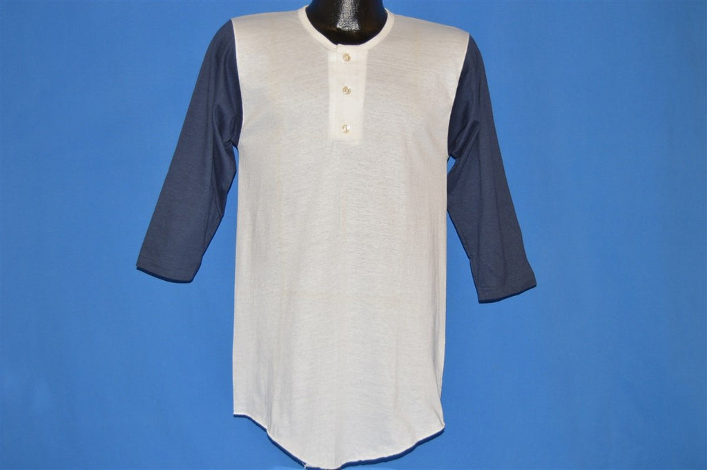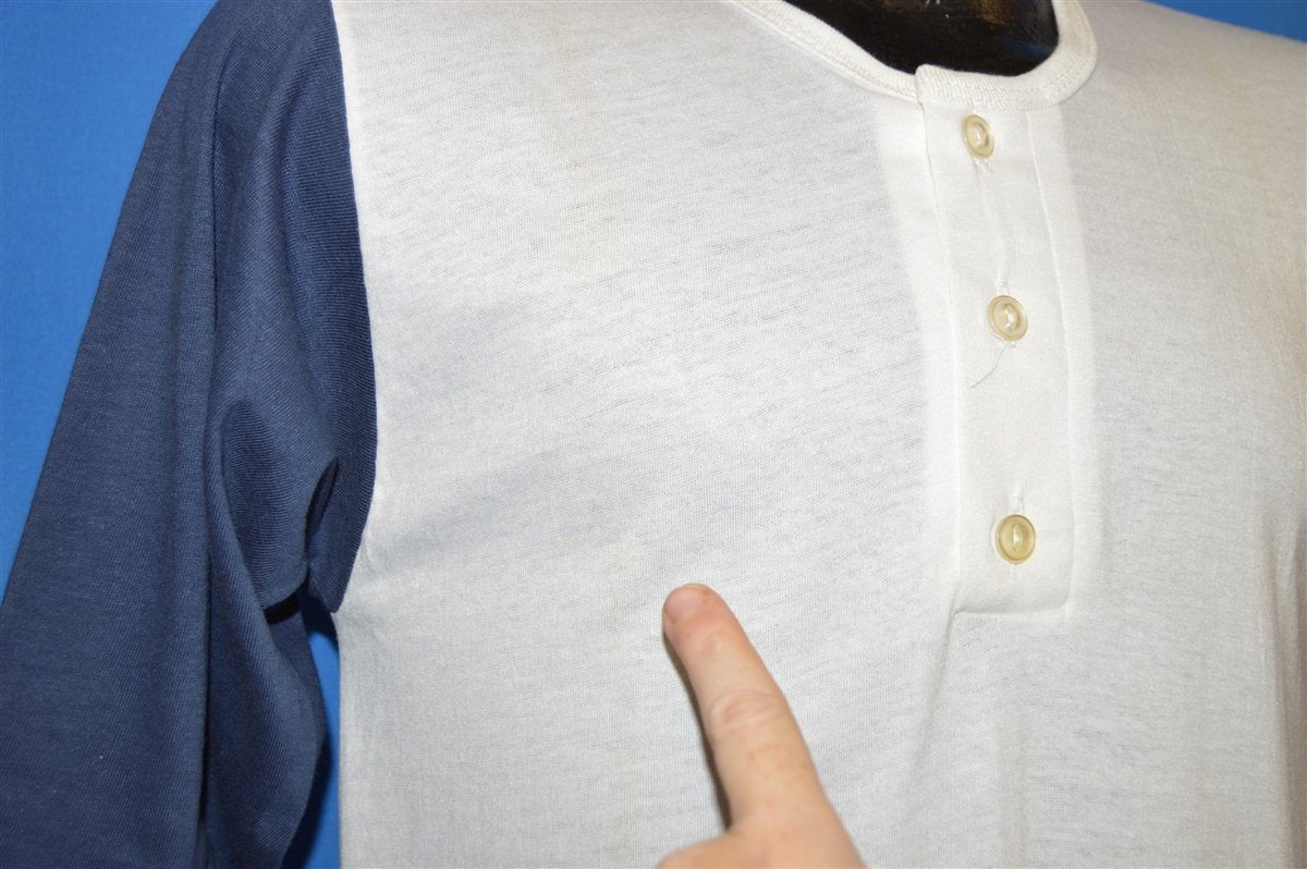 This deadstock t-shirt is from the 70s and features a Henley neckline with two buttons. The body is white and the sleeves are navy blue.