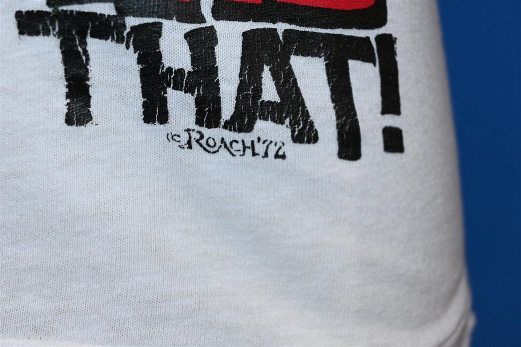 This vintage joke tee has held up great since the 1970s, preserving that old school magic for years to come. Features an epic Roach iron on, lovely cotton feel, and a classic Stedman tag. The cartoon rendering depicts what might be a mad scientist or an otherwise wacky dude with wild hair.
