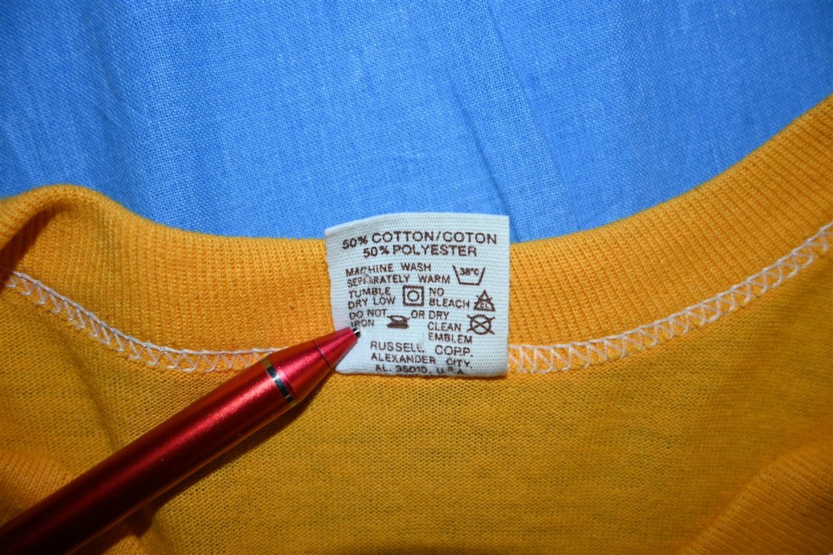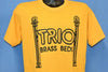 This cool vintage tee was made in the 70s, and it features a bold graphic that's printed on a wonderful shade of goldenrod yellow. The shirt promotes a furniture retailer called Trio Brass Beds. There's not a lot of information surrounding this old business, but there is evidence that there used to be a Trio Brass Beds location near Fort Lauderdale, which boasted the largest selection of brass bed frames in Southeastern Florida.