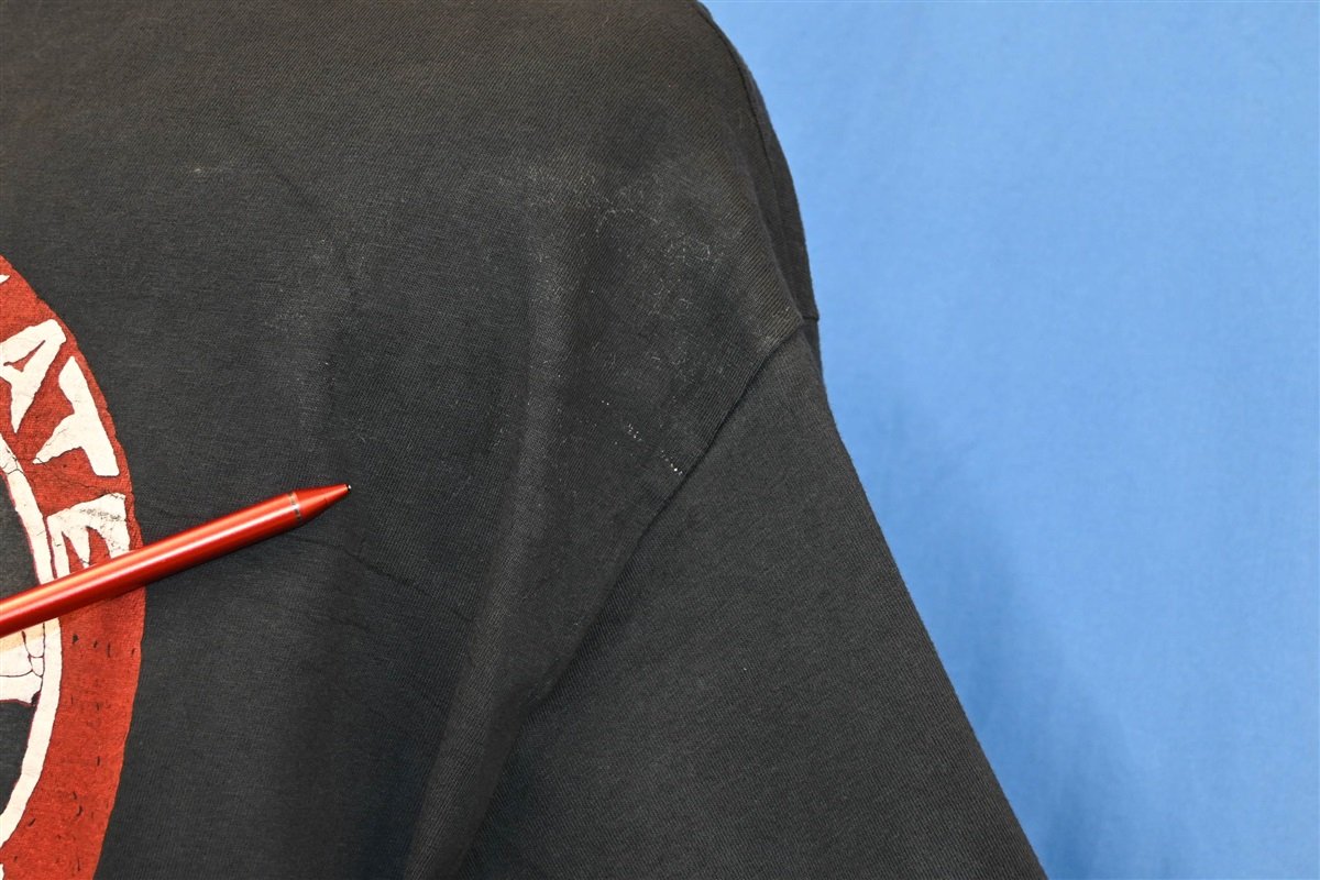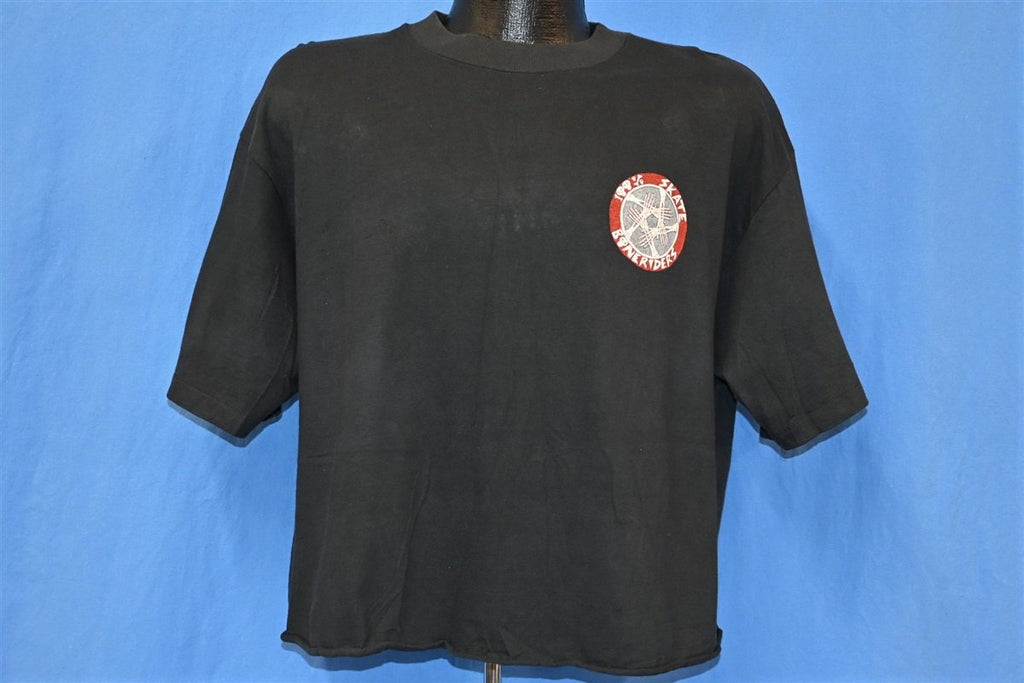 This awesome double-sided skate tee was made back in the 1980s when the sport of skateboarding enjoyed a rise in popularity thanks to the evolution of skate culture. Magazines like Thrasher and skate videos were developed. These pieces of media became a new way for skaters to connect and learn about new gear and tricks.
