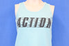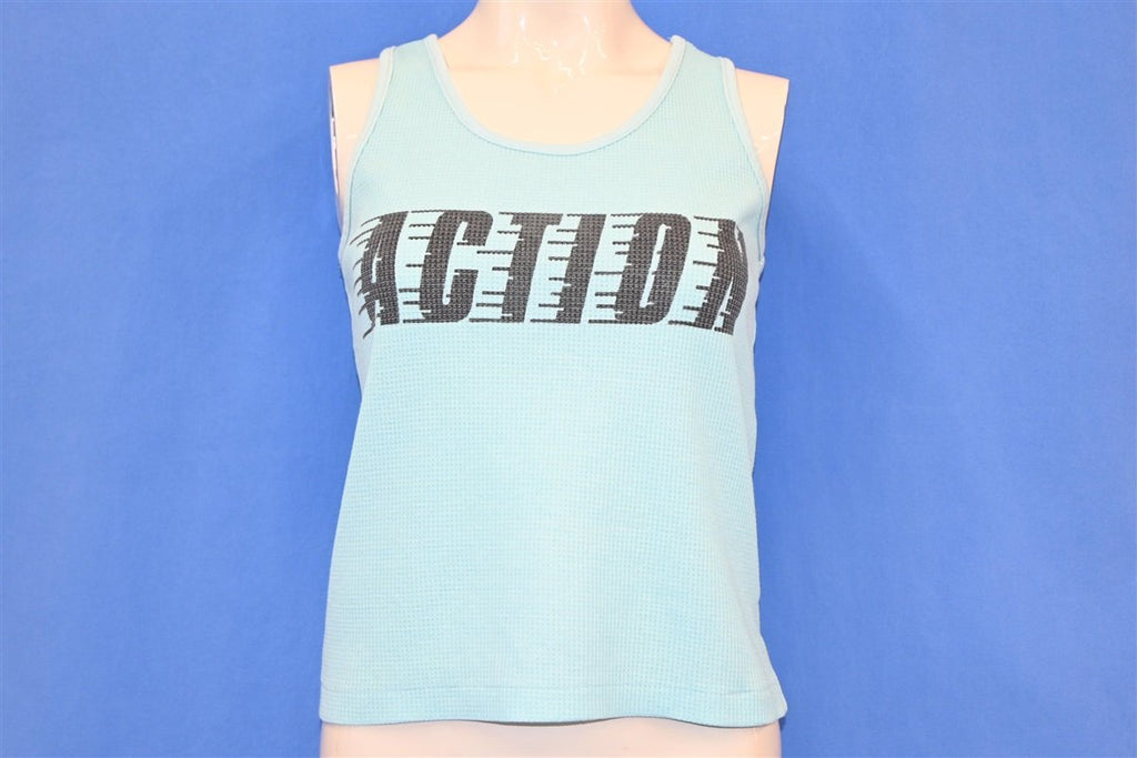 This cool racerback tank top was made back in the 80s, using a super comfy and stretchy waffle knit material. The tank top was made by an apparel company called Club Land 'N Sea, and the shirt has the word action written across it in a bold font.