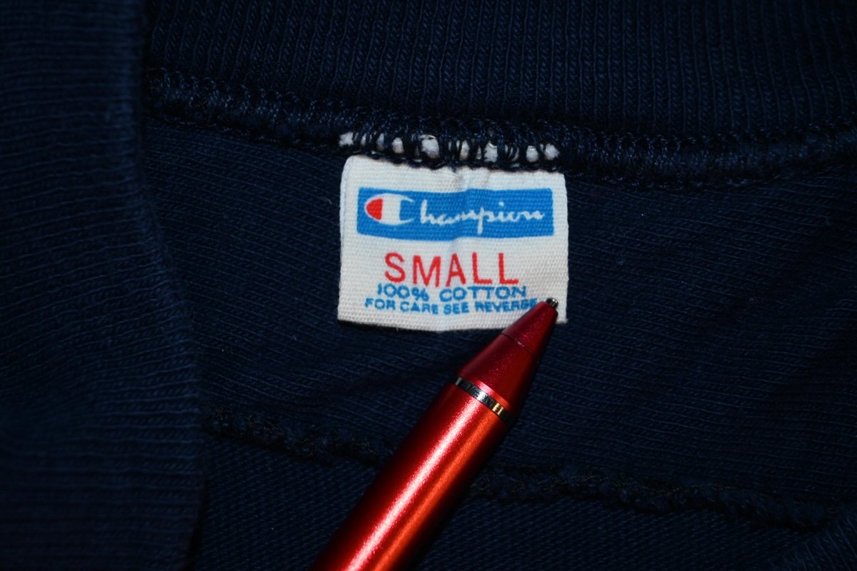 Fits like a modern unisex adult small. Champion blue bar. This shirt is dark blue, double sided print, 3/4 sleeves.