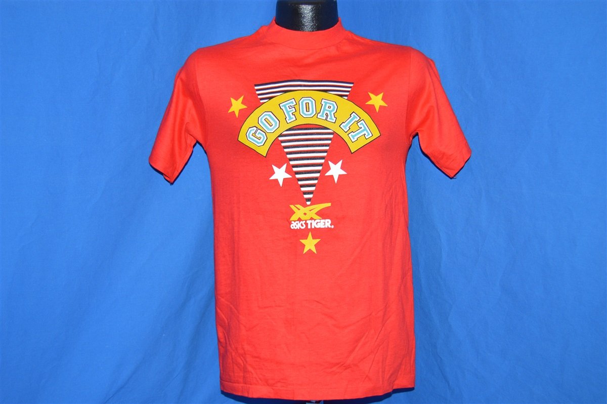 This cool red t-shirt is for the Tiger sneaker made by ASICS. The shirt includes the phrase "go for it". Onitsuka Tiger is one of the oldest shoe brands in Japan, and most people will recognize the classic striped pattern of the Mexico 66 Line. ASICS stands for Anima Sana in Corpore Sano, which is translated to mean "A Healthy Sould in a Healthy Body".