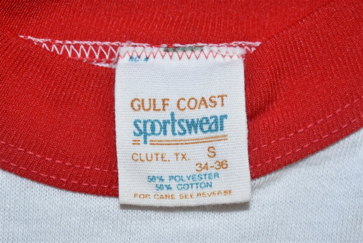 This vintage tee truly captures the essence of 1980s style, featuring a sporty jersey style, raglan sleeves, and old school graphics. It appears to be a souvenir tee from somewhere tropical and touristy. The scene with beaches, boats, and lots of palm trees are reminiscent of places like Hawaii, Florida, or California.