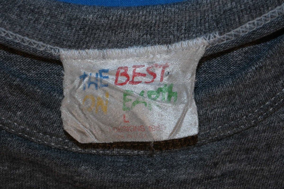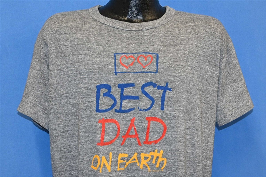 This super soft vintage tee was made for that special father figure in your life. The shirt was made by a company called Best On Earth, that specialized in tees celebrating the loved ones in your life. This heathered gray shirt lovingly declares the wearer, the best dad on Earth.