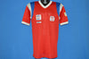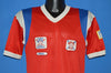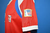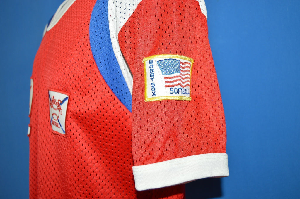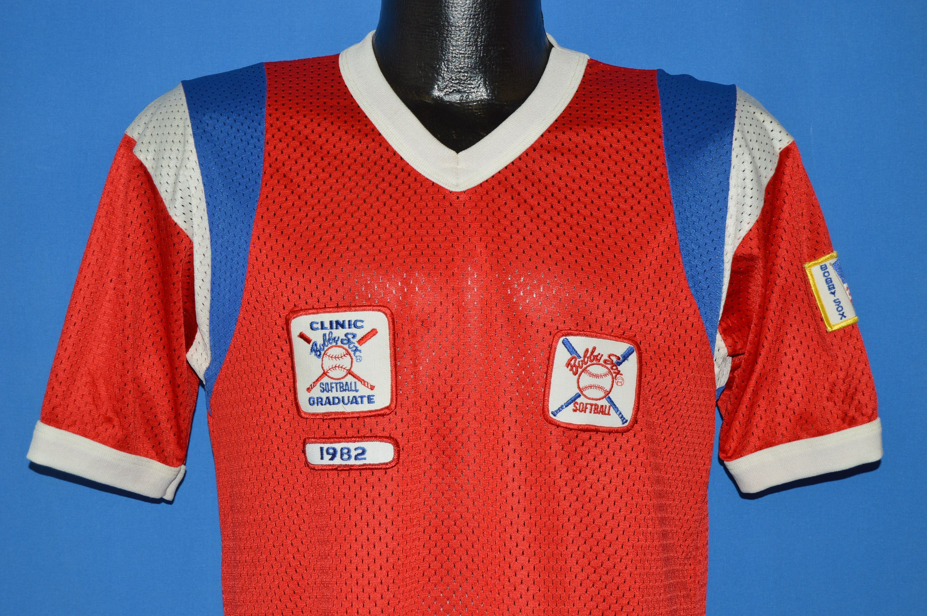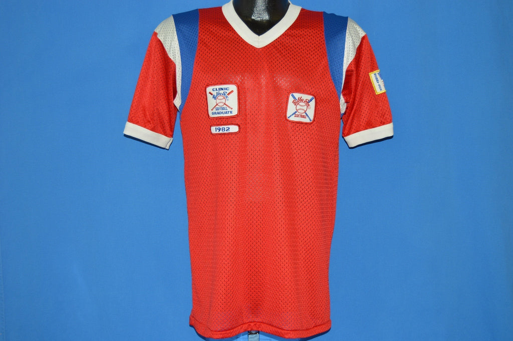 This multi-colored mesh jersey is from the Bobby Sox Softball in the 80s. The v-neck ringer shirt features blue and white shoulder detailing and three patches sewn on the front and another on the sleeve. The patches are all from Bobby Sox Softball with one featuring the text "Bobby Sox Softball Clinic Graduate" and another with the year "1982".
