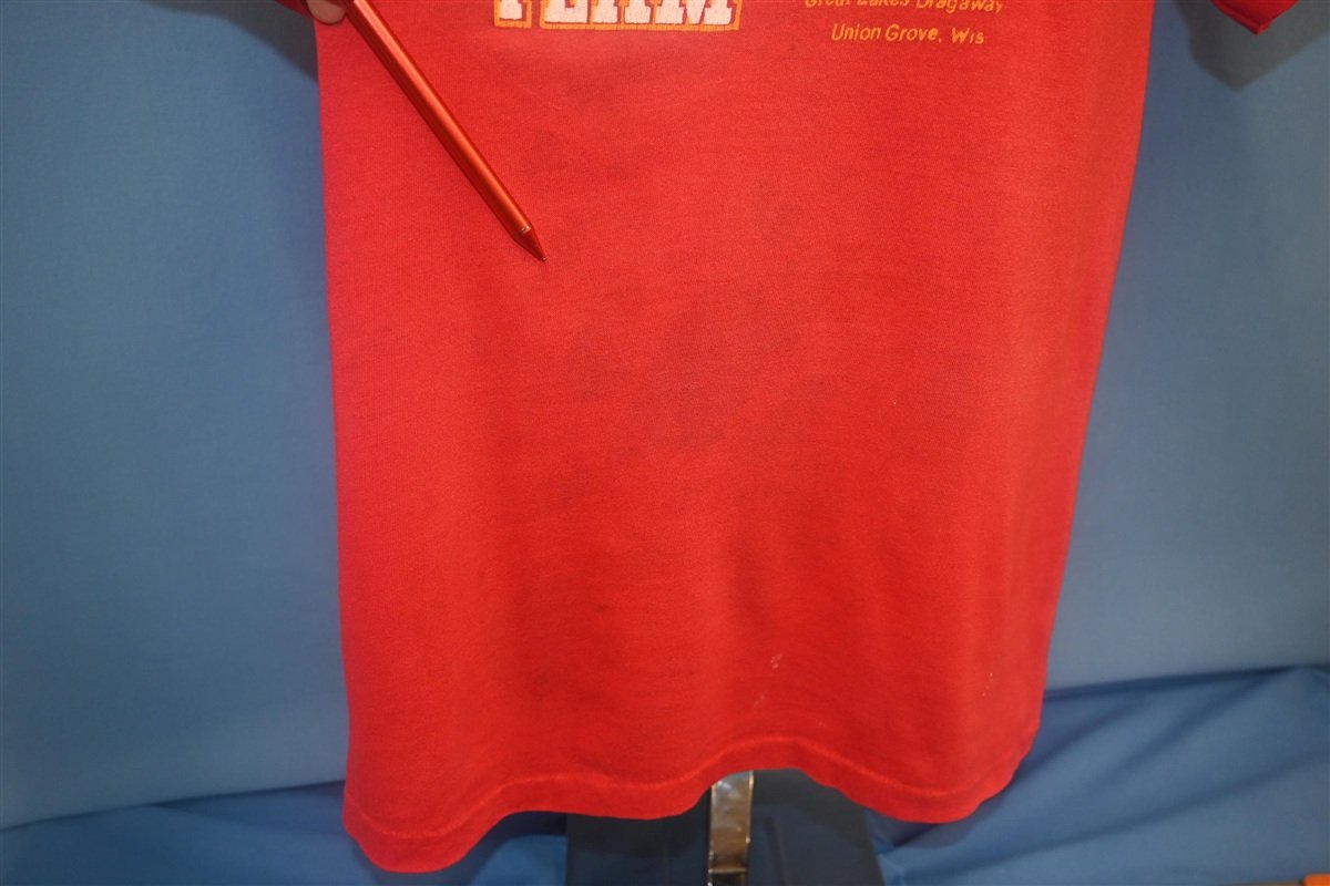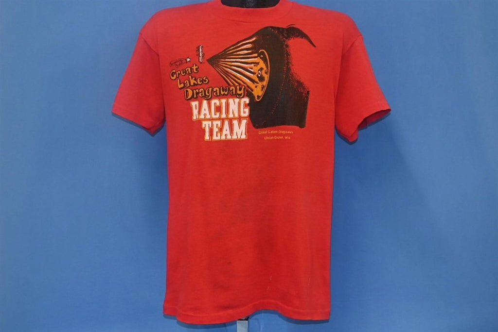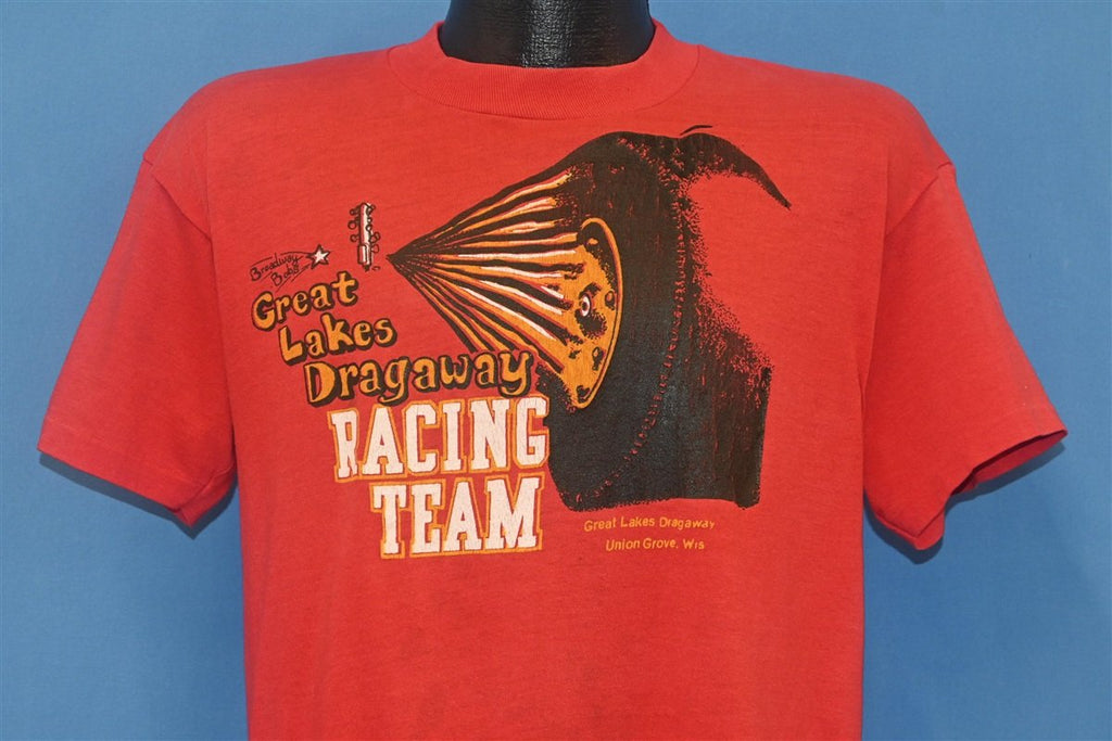 This awesome tee was made for a racing team belonging to Great Lakes Dragaway near Union Grove, Wisconsin. The drag strip first opened in 1955, and it was owned by celebrated local drag race promoter Robert Metzler, better known as Broadway Bob. Metzler earned his Broadway nickname thanks to his colorful and flashy attire, and he was integral to bringing attention to the Wisconsin raceway during a time when Southern California ruled the drag racing scene. Great Lakes is one of the oldest continuously operating drag strips in the world, and in 2015 it became a member track of the International Hot Rod Association.