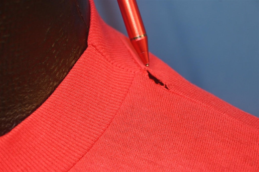 Fits like a modern unisex adult medium. There are light spots on the front and a hole near the collar, see pics.
