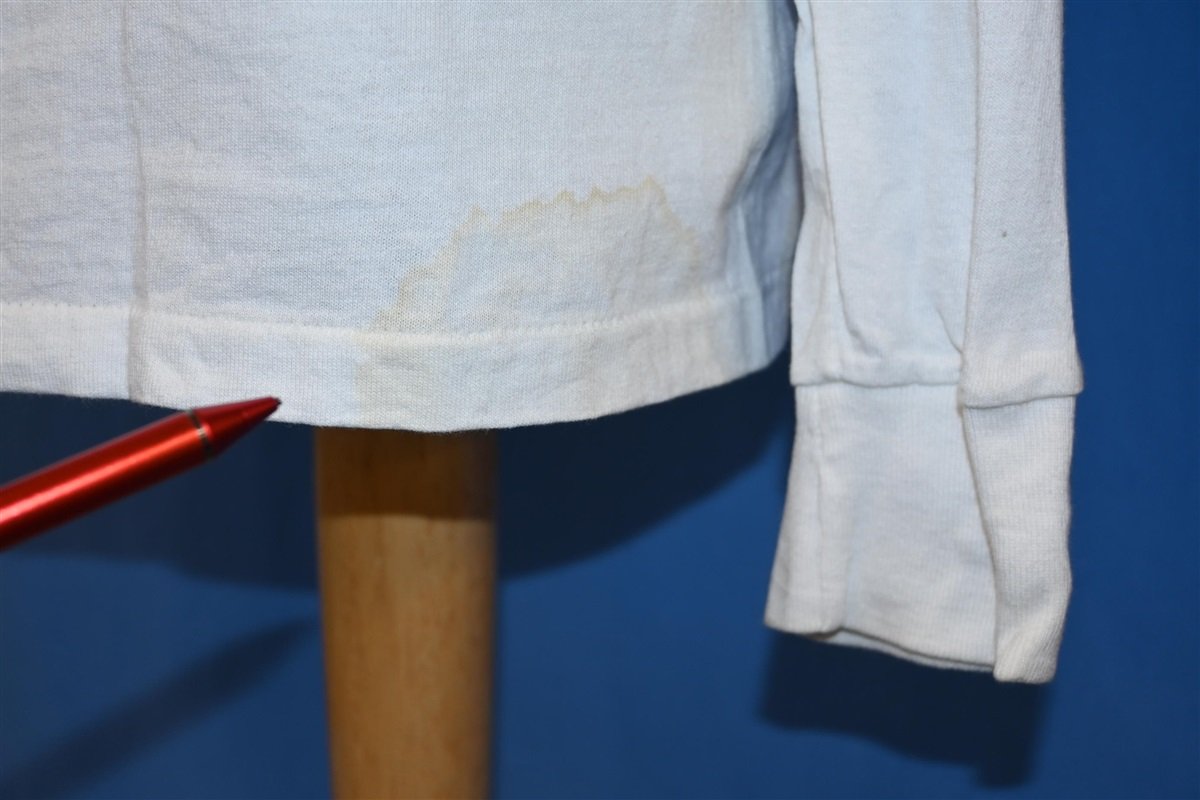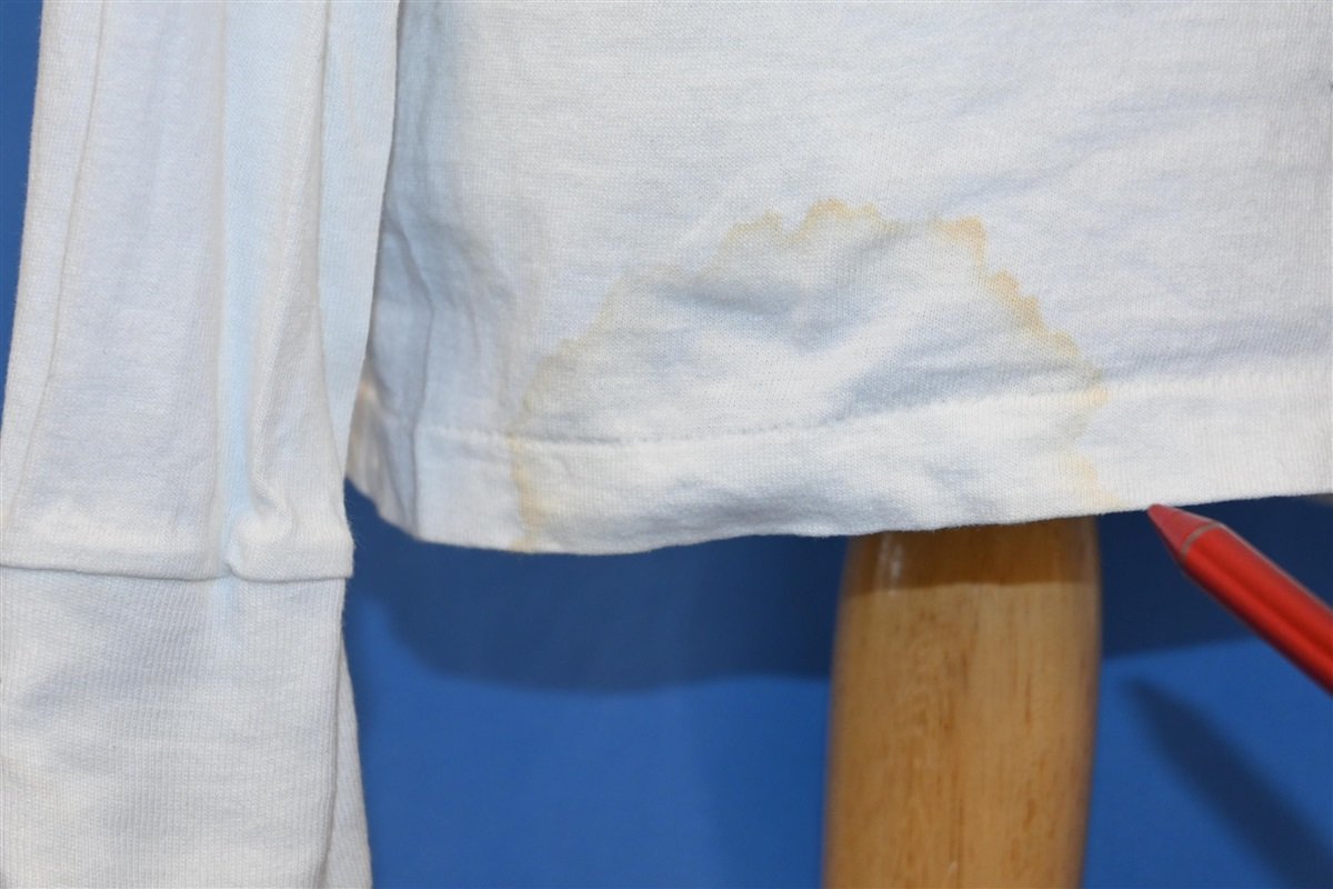 Fits like a modern unisex youth oversized medium. This shirt is deadstock, unworn. There is some discoloration throughout, see pics.