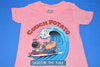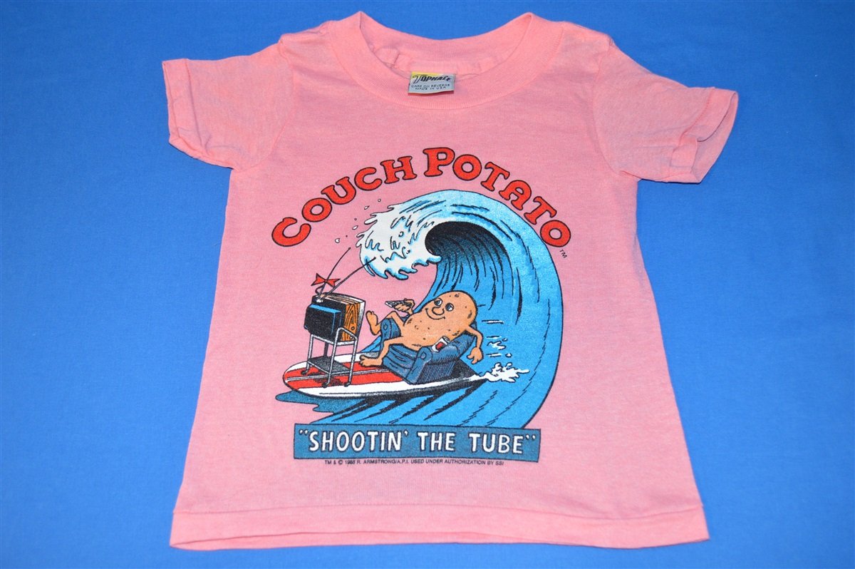 This pink t-shirt has a funny graphic of the Couch Potato. The spud is hanging out on his comfy chair surfing the channels on the television. At the same time he is on a surfboard riding a wave. The punny caption says "Shootin' the Tube".