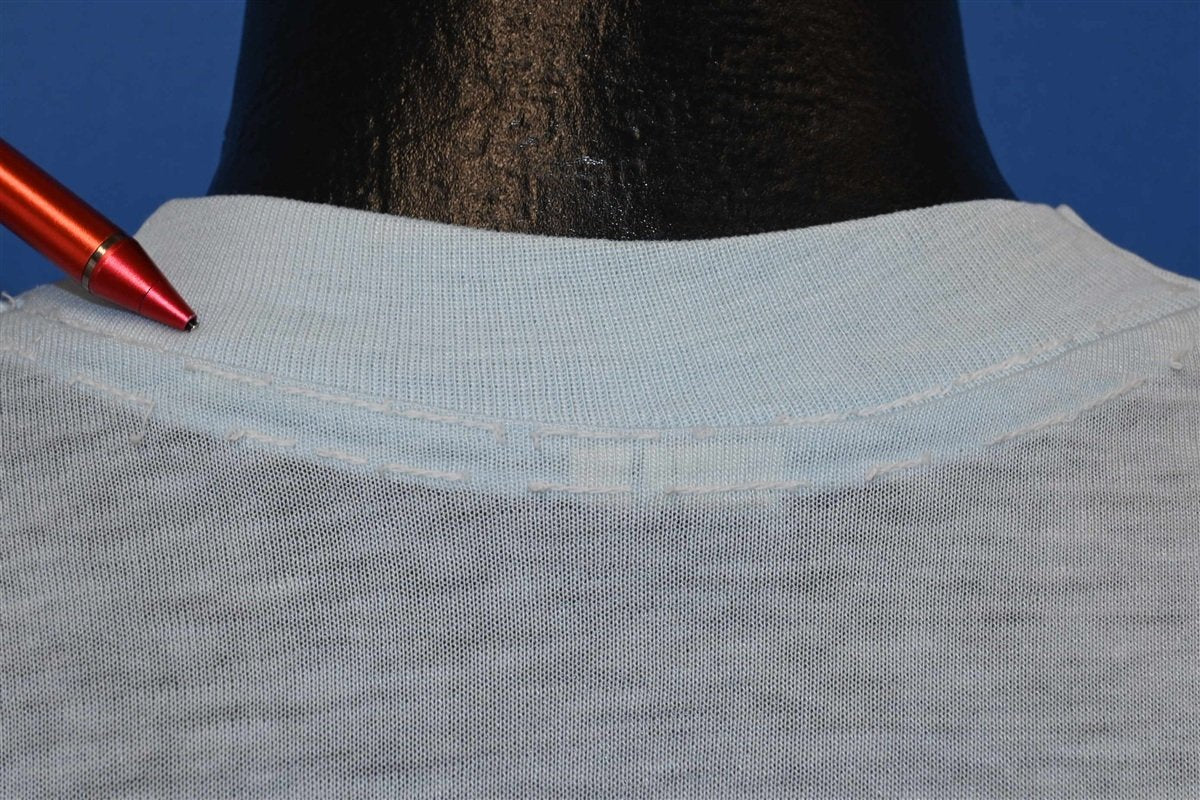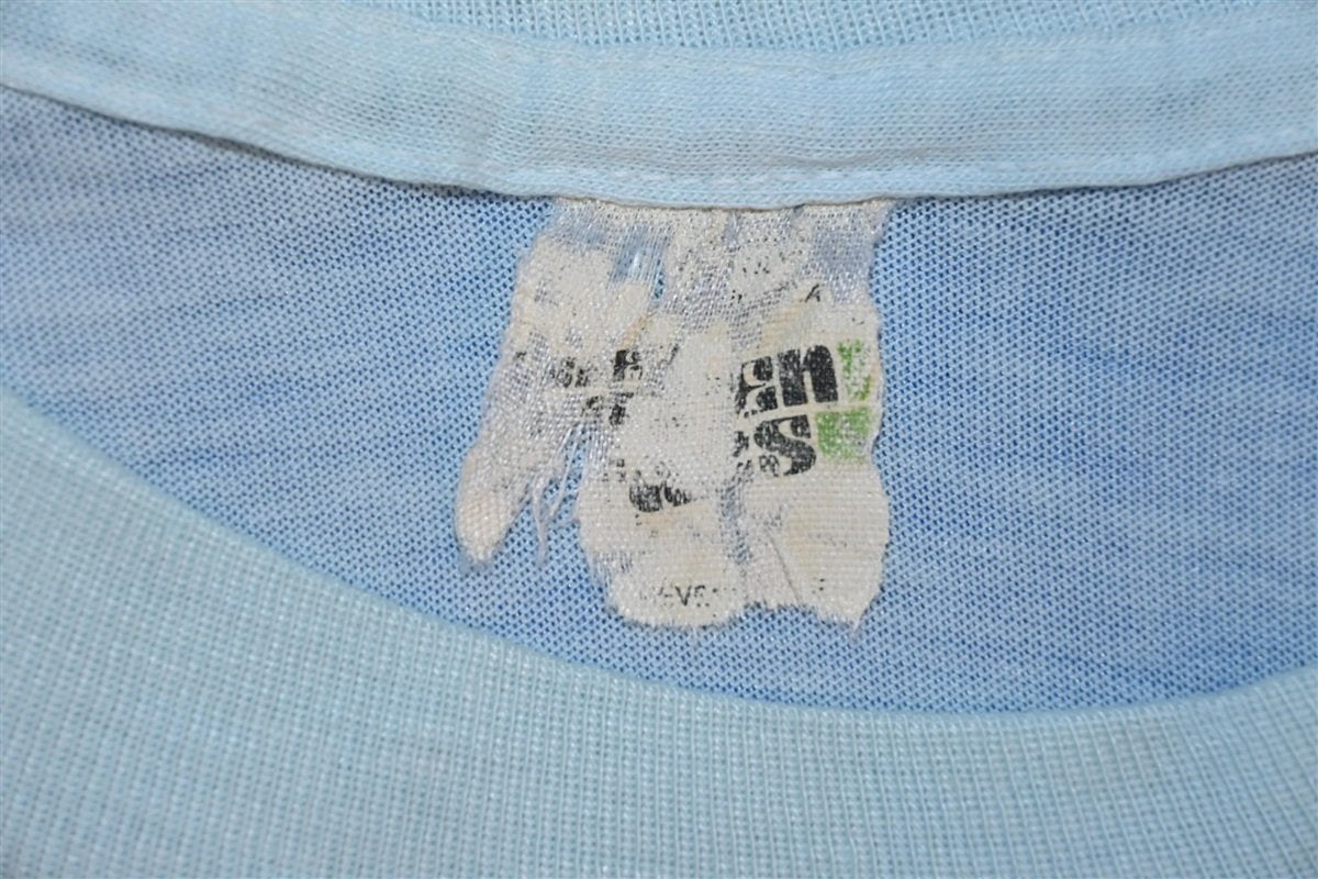 Fits like a modern unisex adult medium. This shirt is soft and thin with some small holes and wear along the collar, see pics.