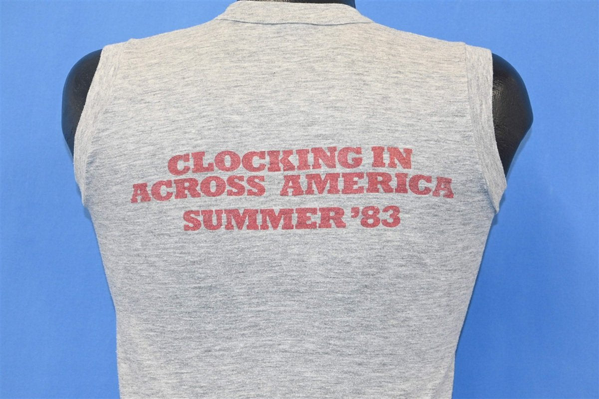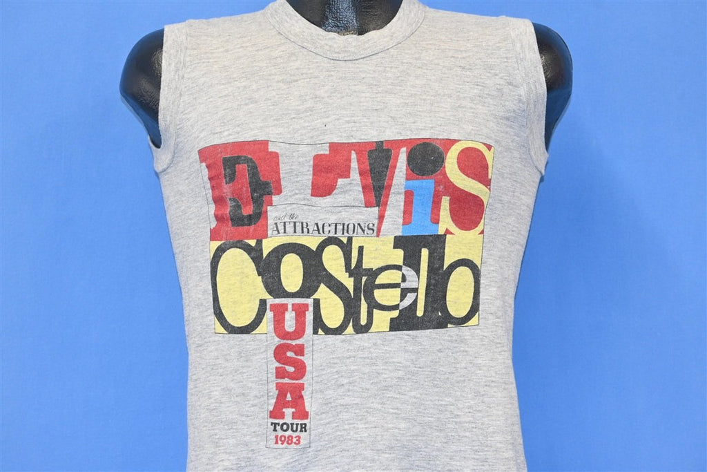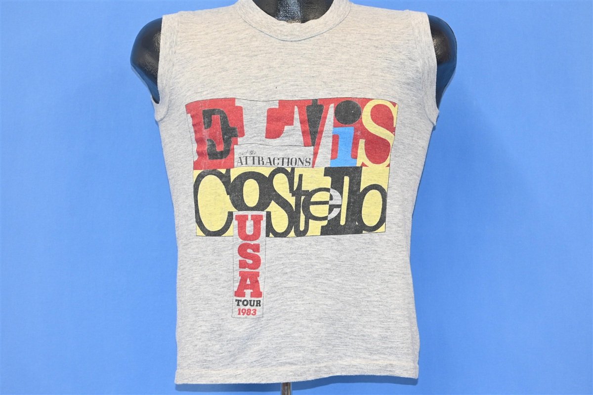 This awesome muscle tee is from the 1983 US Tour for Elvis Costello and the Attractions. That year Costello and his band released their seventh studio album together, Punch the Clock, which was also the singer's eighth studio album overall. Punch the Clock yielded their first ever top 40 hit in the US, "Everyday I Write the Book", and it also included the tracks "Pills and Soap", "Let Them All Talk", and "Shipbuilding".