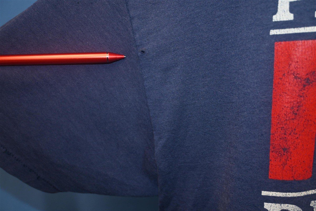 Fits like a modern unisex adult Extra Large. This shirt is soft and faded with a hole on the back, see pics.