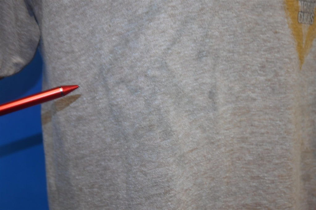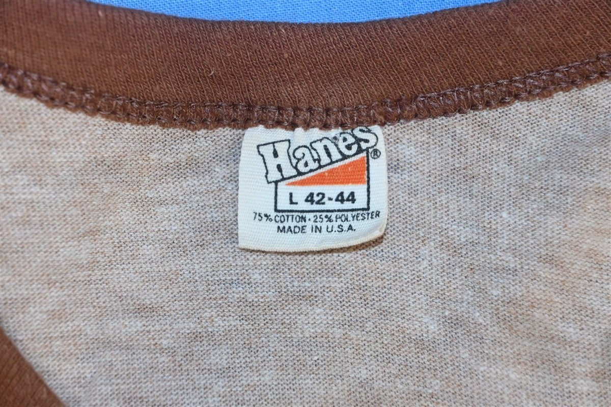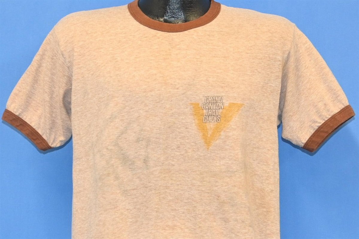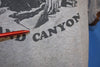 This cool heathered ringer promotes a guided hiking business called Grand Canyon Trail Guides, and the back features a delightfully cheeky image of a flasher encouraging you to "expose yourself to the Grand Canyon". The Grand Canyon has long been one of America's most popular and awe-inspiring sites, and it attracts millions of tourists each year with various rafting, hiking, and helicopter tours. This shirt hails from the 80s, when the canyon was featured in the film National Lampoon's Vacation, which helped cement its status as a can't-miss road trip destination.