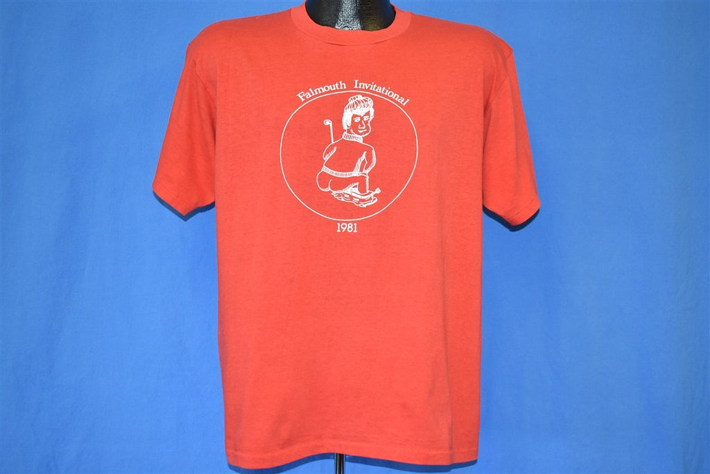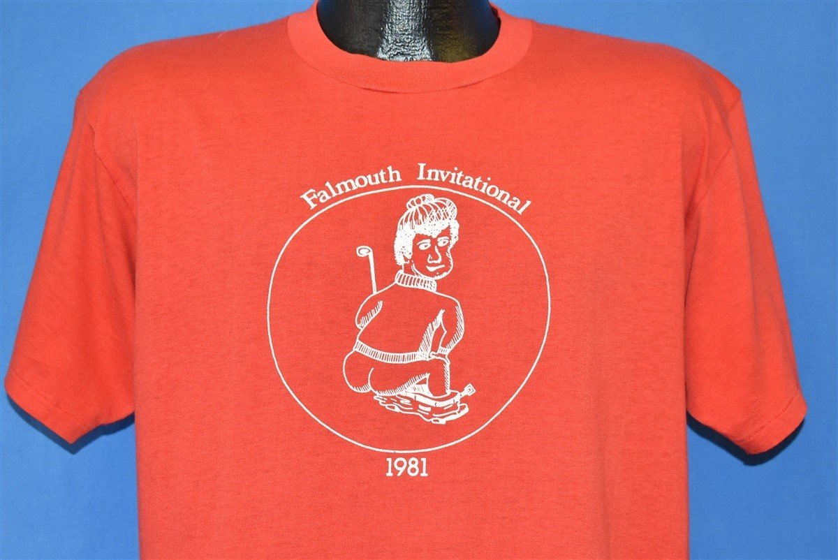 This goofy joke shirt advertises a possibly fictional Falmouth golf invitational from 1981. Falmouth is a real town located in Massachusetts and it is home to numerous golf courses, but none of them seem to be the host of a Falmouth Invitational. This shirt features a delightfully crude cartoon of a golfer with his pants down and his butt hanging out.