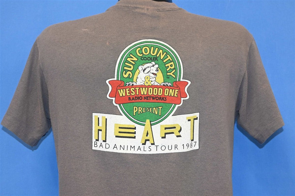 This sweet band tee is for Heart, and it was made for their 1987 Bad Animals Tour. The tour was presented thanks to Sun Country Cooler and the New York-based radio network, Westwood One, and it promoted the group's ninth studio album of the same name. Bad Animals was a commercial success that continued the band's foray into a more mainstream hard rock style. The album peaked at number two on the Billboard 200, and it featured the chart topping single "Alone". The power ballad actually wound up becoming the group's most successful song, spending three weeks at number one.