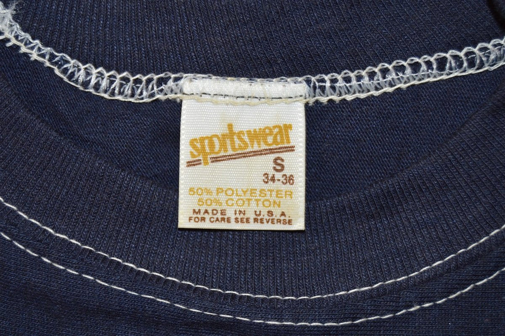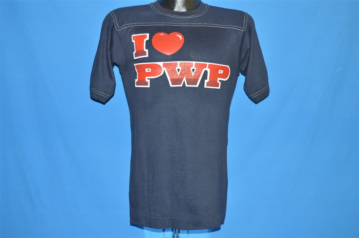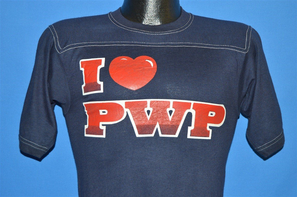 This vintage jersey style shirt was made back in the 80s and it comes in a rich dark navy blue with white top stitching. The shirt says "I Love PWP" on the front in red block letters with a white drop shadow. The word love is replaced by a heart. The shirt is made of a buttery soft cotton blended material that allows for both style and comfort.