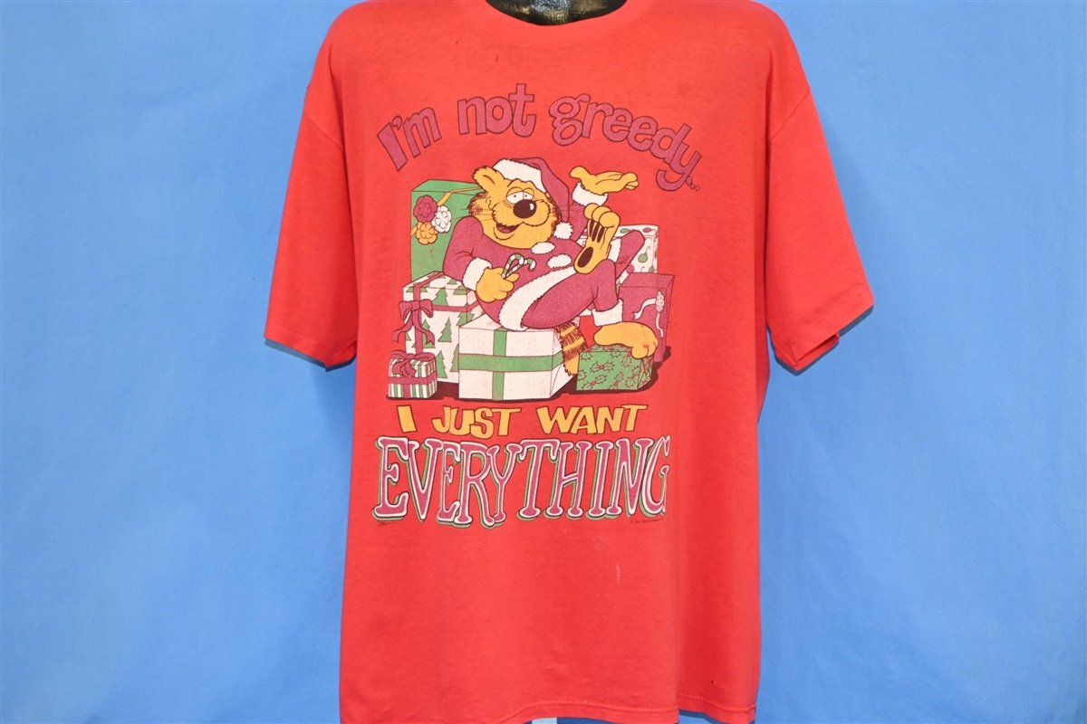 This goofy holiday tee reads, "I'm not greedy I just want everything". This shirt also features a cartoon cat dressed up as Santa Claus. This vintage tee is perfect for anyone whose favorite Christmas activity is receiving gifts.