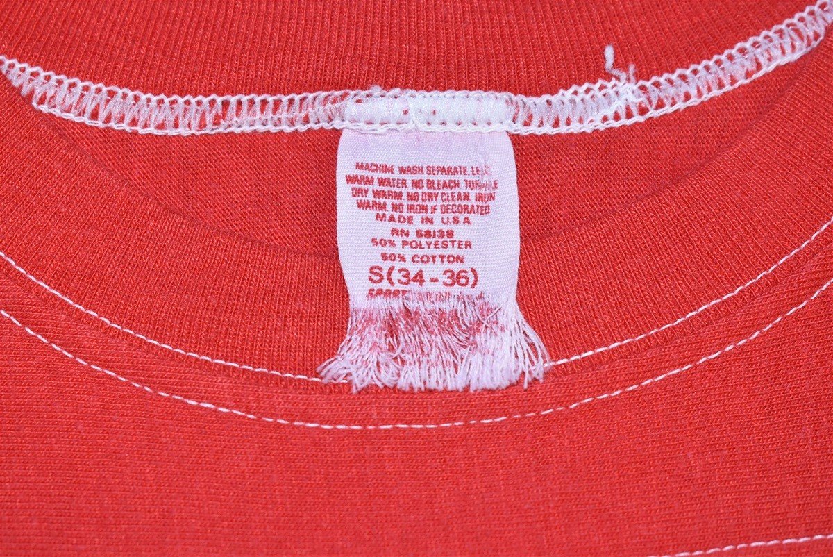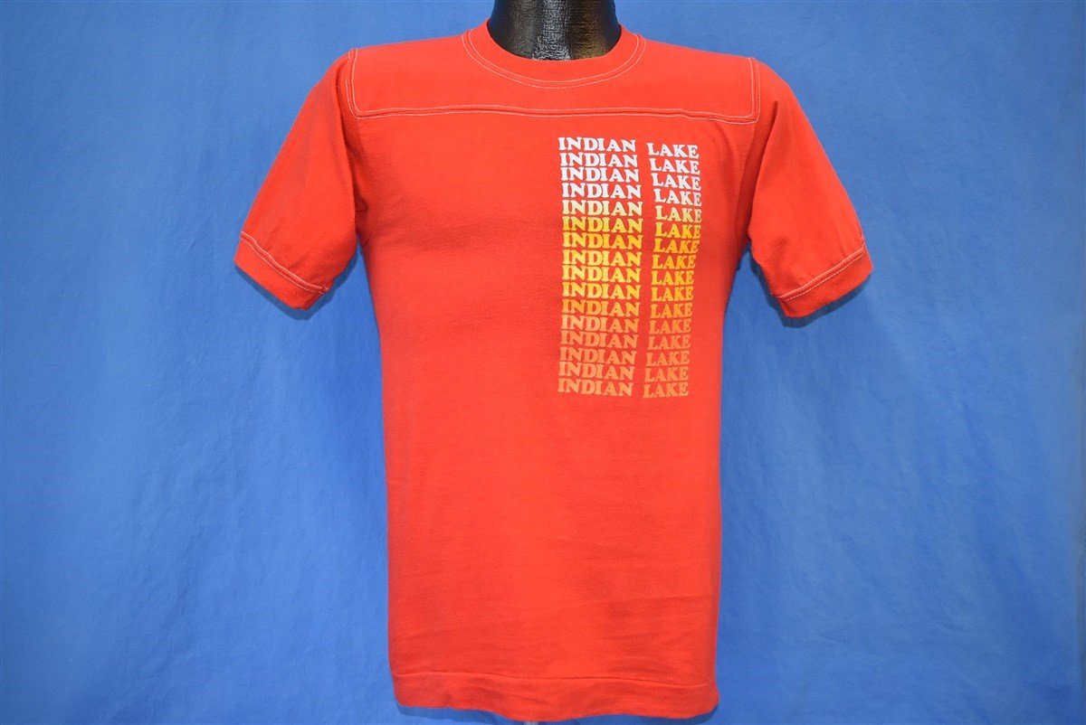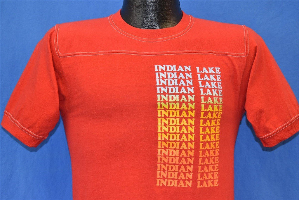 This 80s tee is from Indian Lake in Hamilton County, New York. It features a rainbow print, as well as exposed stitching. Indian Lake feeds into the Indian River, Lake Abanakee, and the Hudson River, It's a popular destination for camping, swimming, and fishing.