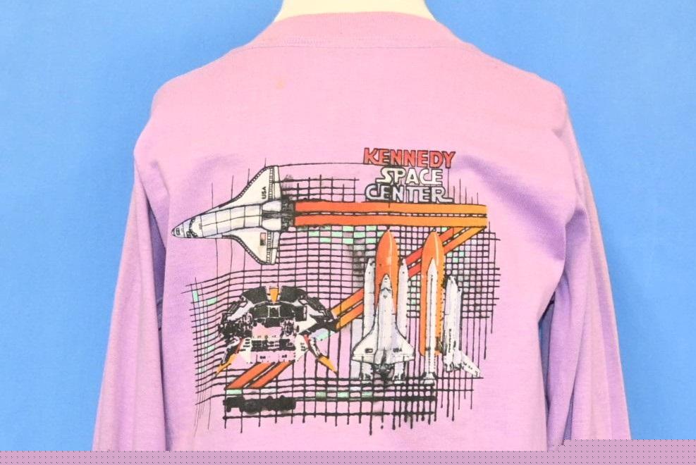 This cool kid's t-shirt pays tribute to the Kennedy Space Center found on Merritt Island in Florida. KSC is one of several field centers operated by NASA and it is most famous for being the primary launch site of their space shuttle program. This shirt was made in the 80s, when KCS was the launch site for the shuttles Atlantis, Discovery, Challenger and Columbia.