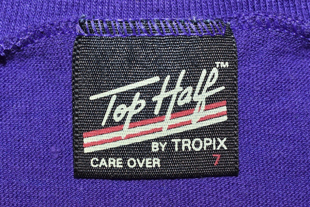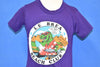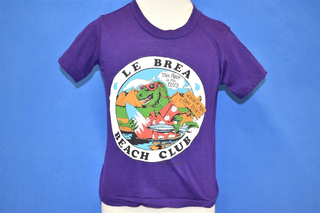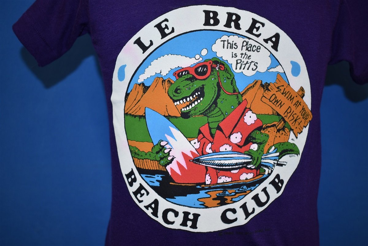 This shirt has a graphic on the front of a dinosaur with an umbrella and a surfboard. He's sitting in a lake thinking "This place is the pitts". The La Brea Tar Pits are a group of tar pits around which Hancock Park was formed in Los Angeles. Many prehistoric animals got stuck in the tar pits and died there. Around the graphic it says "Le Brea Beach Club".