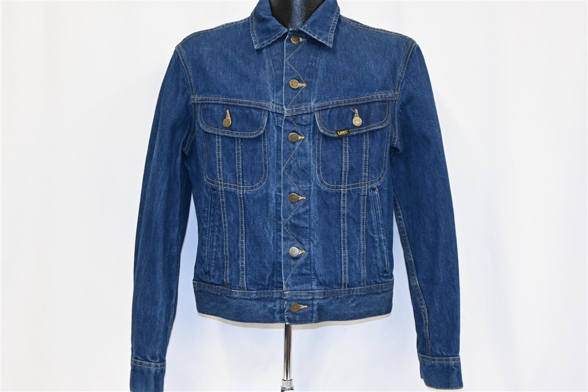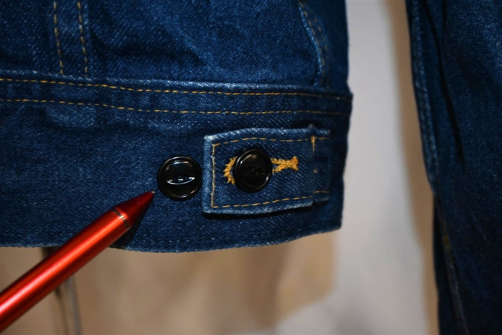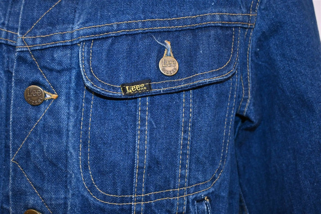 This sweet vintage jacket is a signature denim rider jacket from the company Lee. It was made in the 80s, and the jacket sports several signature details that Lee rider jackets are known for. This includes the plastic buttons along the waist and zig zag stitching down the front. This jacket also features button front closures and two button flapped chest pockets.